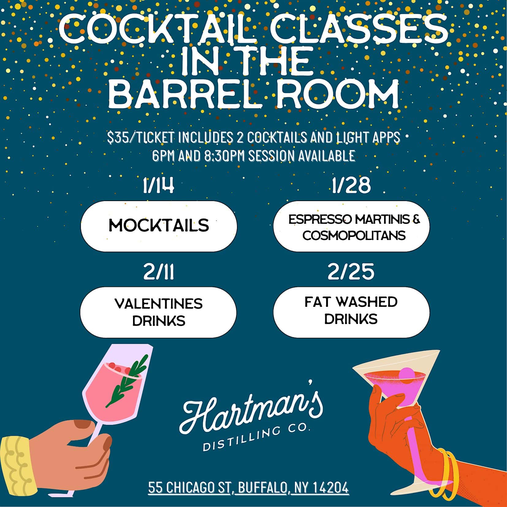 by admin14Feb Fat Washed Cocktails session 2 at 55 Chicago St – Buffalo, NY Fat Washed Cocktails session 2 at 55 Chicago St – Buffalo, NY 2 2 people viewed this event. Explore the art of fat-washing in this hands-on cocktail class! Tickets-RSVP Link Date And Time Thursday, February 26th, 2026 01:00 AM (PST) Venue 55 Chicago St Location 55 Chicago Street, Buffalo, NY 14204 Event Types Food & Drink Event Category BuffaloNew York Share With Friends Facebook Twitter Linkedin Xing Pinterest Share This Post: