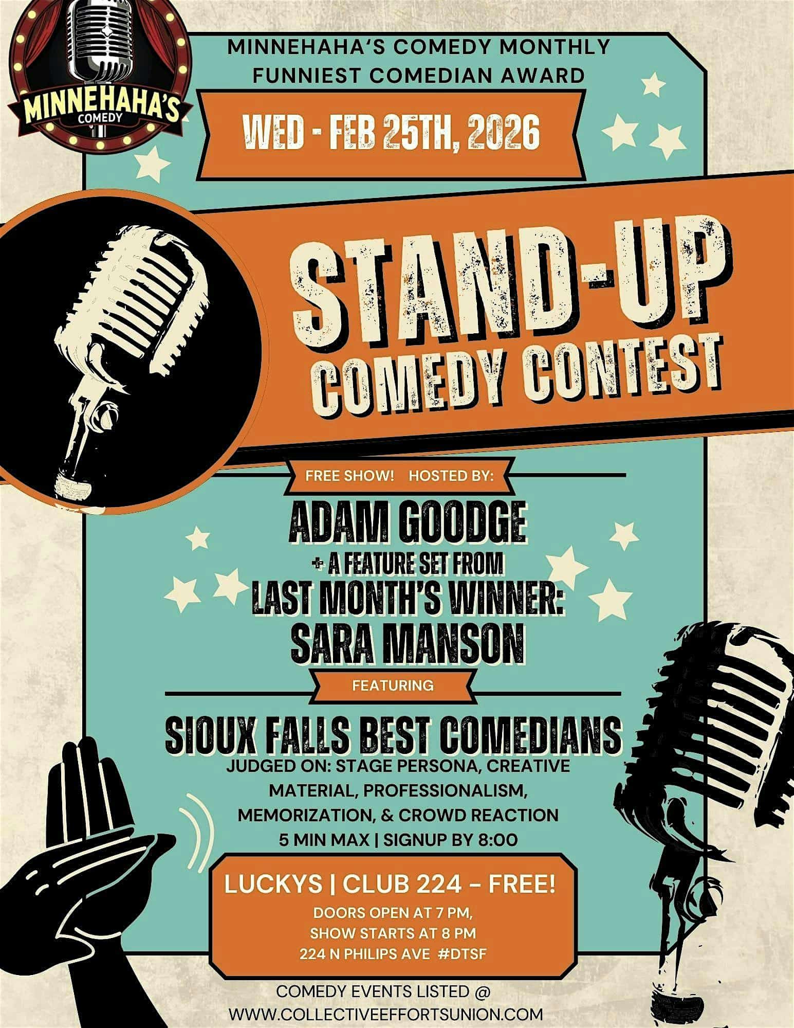 by admin14Feb FREE SHOW! Monthly Sioux Falls Funniest Comic Contest at Lucky’s – Sioux Falls, SD FREE SHOW! Monthly Sioux Falls Funniest Comic Contest at Lucky’s – Sioux Falls, SD 2 2 people viewed this event. Monthly Sioux Falls Funniest Comic Contest – FREE! Tickets-RSVP Link Date And Time Thursday, February 26th, 2026 01:00 AM (PST) Venue Lucky's Location 224 South Phillips Avenue, Sioux Falls, SD 57104 Event Types Concert or PerformancePerforming & Visual Arts Event Category South Dakota Share With Friends Facebook Twitter Linkedin Xing Pinterest Share This Post:
