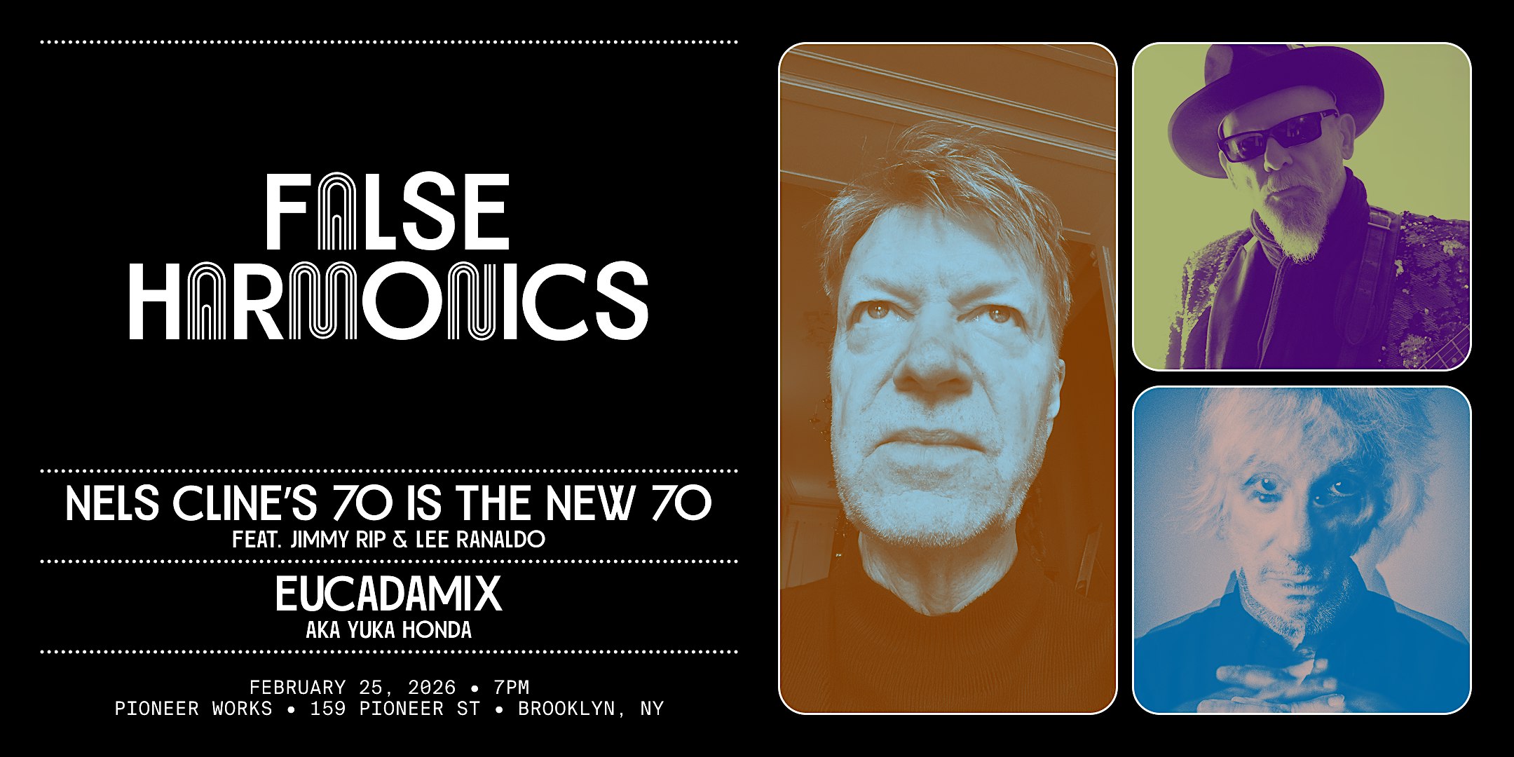 by admin13Feb Nels Cline’s 70 is the New 70 feat. Jimmy Rip & Lee Ranaldo and EUCADEMIX at Pioneer Works – Brooklyn, NY Nels Cline’s 70 is the New 70 feat. Jimmy Rip & Lee Ranaldo and EUCADEMIX at Pioneer Works – Brooklyn, NY 1 1 people viewed this event. Pioneer Works is excited to present the 24th False Harmonics, a series that explores new musical ideas. Tickets-RSVP Link Date And Time Thursday, February 26th, 2026 01:00 AM (PST) Venue Pioneer Works Location 159 Pioneer Street, Brooklyn, NY 11231 Event Types Concert or PerformanceMusic Event Category New York Share With Friends Facebook Twitter Linkedin Xing Pinterest Share This Post:
