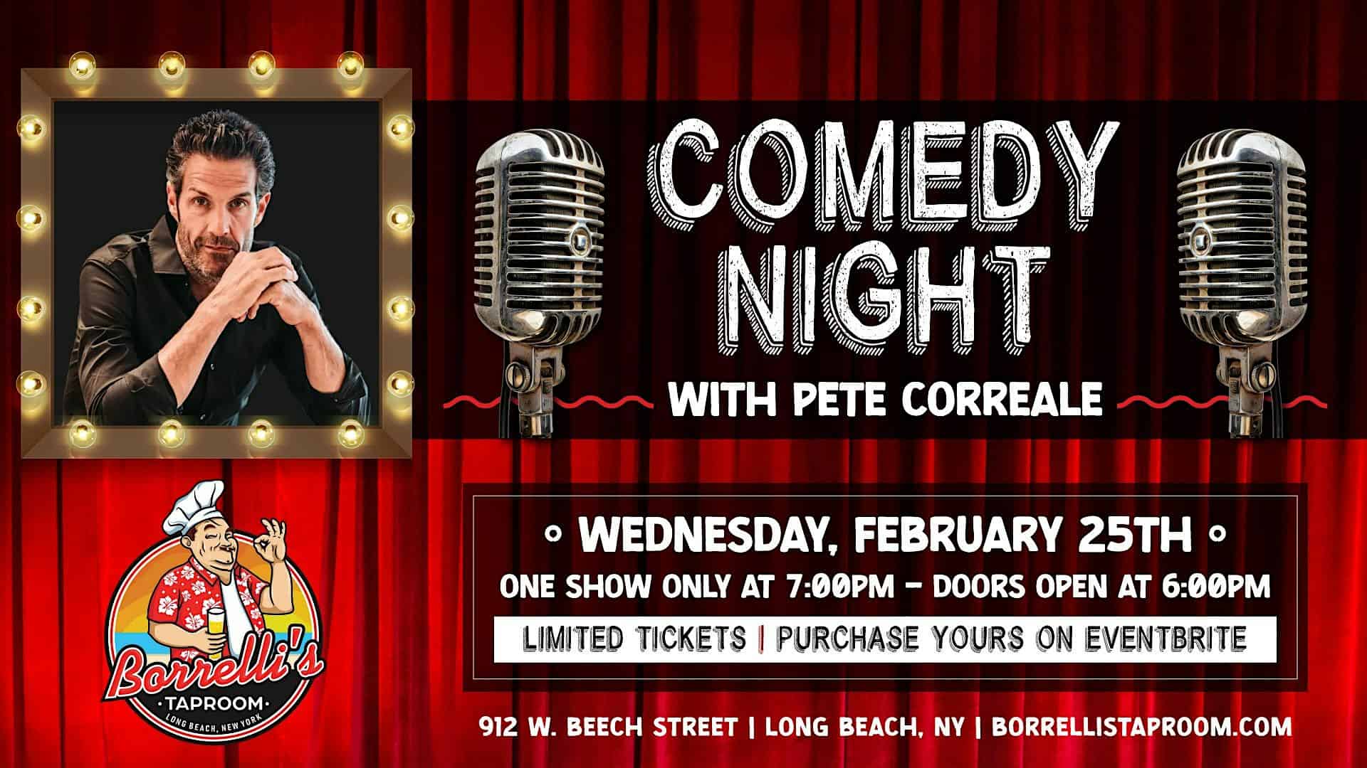 by admin14Feb Peter Correale Comedy Night @Borrelli’s Taproom at Borrelli’s Taproom – Long Beach, NY Peter Correale Comedy Night @Borrelli’s Taproom at Borrelli’s Taproom – Long Beach, NY 2 2 people viewed this event. Come see Pete Correale take the Borrelli’s comedy stage. 2 item purchase necessary. Full dinner, pizza, and cocktail menu available. Tickets-RSVP Link Date And Time Thursday, February 26th, 2026 12:00 AM (PST) Venue Borrelli's Taproom Location 912 West Beech Street, Long Beach, NY 11561 Event Types Concert or PerformancePerforming & Visual Arts Event Category New York Share With Friends Facebook Twitter Linkedin Xing Pinterest Share This Post: