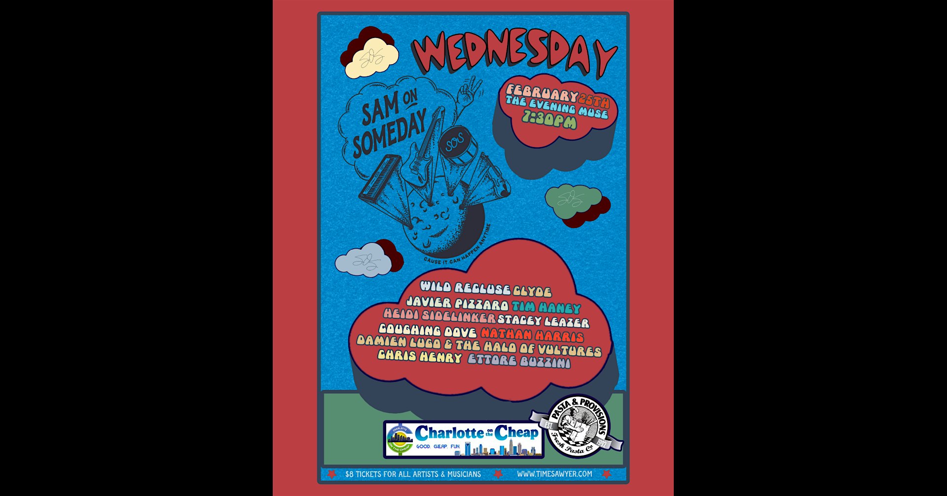 by admin13Feb Sam on Someday at The Evening Muse – Charlotte, NC Sam on Someday at The Evening Muse – Charlotte, NC 1 1 people viewed this event. Sam on Someday at The Evening Muse! Tickets-RSVP Link Date And Time Thursday, February 26th, 2026 12:00 AM (PST) Venue The Evening Muse Location 3227 N. Davidson Street, Charlotte, NC 28205 Event Types Concert or PerformanceMusic Event Category CharlotteNorth Carolina Share With Friends Facebook Twitter Linkedin Xing Pinterest Share This Post: