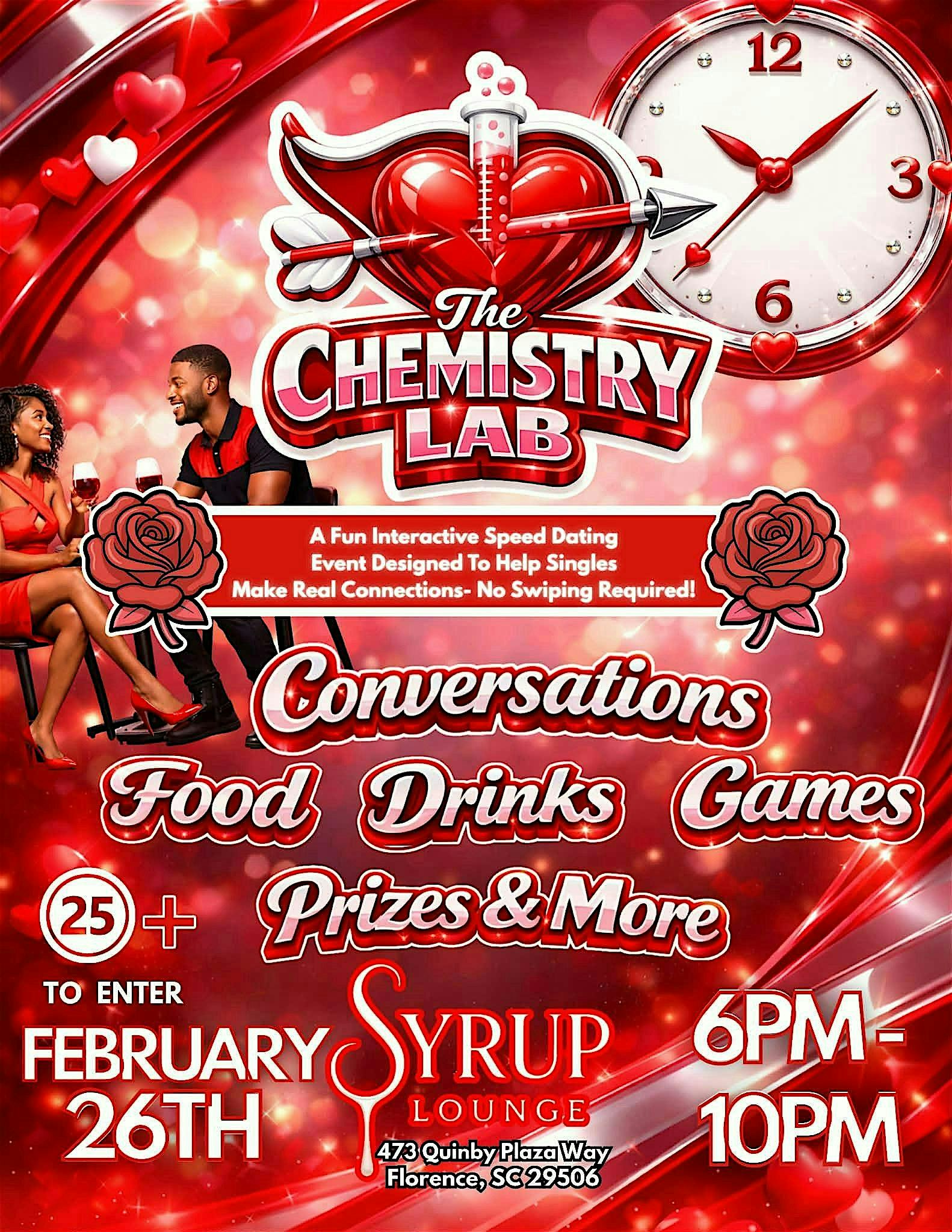 by admin22Feb The Chemistry Lab Speed Dating at Tootsie’s Everything Waffle – Quinby, SC The Chemistry Lab Speed Dating at Tootsie’s Everything Waffle – Quinby, SC 2 2 people viewed this event. The Chemistry Lab is a Valentine’s speed dating event for singles 25+. Games, drinks, and real connections ✨ Tickets-RSVP Link Date And Time Thursday, February 26th, 2026 06:00 PM (PST) Venue Tootsie's Everything Waffle Location 473 Quinby Plaza Way, Quinby, SC 29506 Event Types OtherParty or Social Gathering Event Category South Carolina Share With Friends Facebook Twitter Linkedin Xing Pinterest Share This Post: