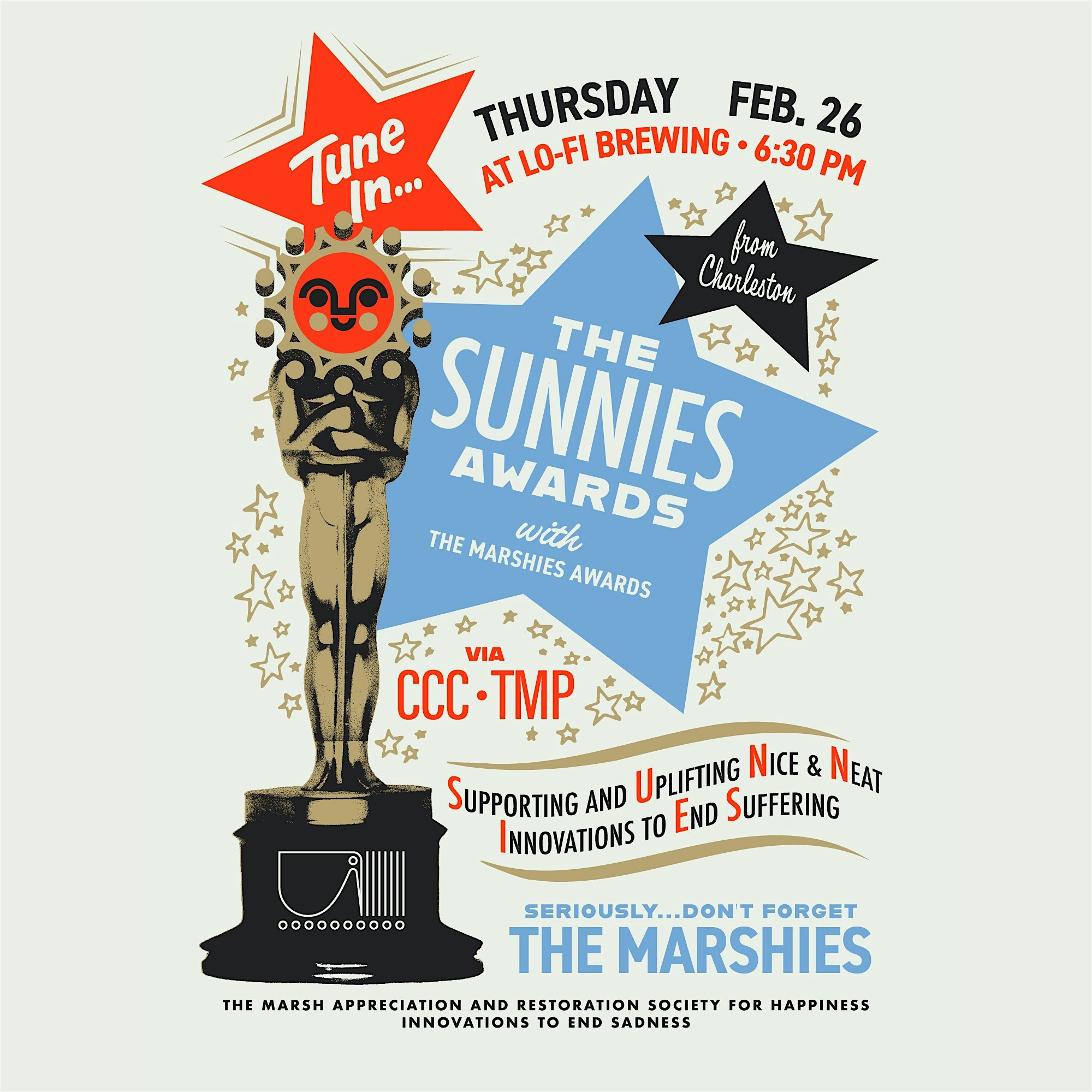 by admin22Feb The Sunnies & The Marshies Awards at LO-Fi Brewing – North Charleston, SC The Sunnies & The Marshies Awards at LO-Fi Brewing – North Charleston, SC 2 2 people viewed this event. If the Oscars were for Charleston’s nature and climate leaders. From your friends at the Charleston Climate Coalition and Marsh Project! Tickets-RSVP Link Date And Time Thursday, February 26th, 2026 06:00 PM (PST) Venue LO-Fi Brewing Location 2038 Meeting Street Road, North Charleston, SC 29405 Event Types Party or Social GatheringPerforming & Visual Arts Event Category CharlestonSouth Carolina Share With Friends Facebook Twitter Linkedin Xing Pinterest Share This Post: