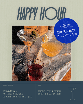 Enjoy $10 gin martinis, sazeracs, and whiskey sours during the Three Top Happy Hour, every Thursday from 5:30pm-7pm! RSVP DOES NOT GUARANTEE ENTRY