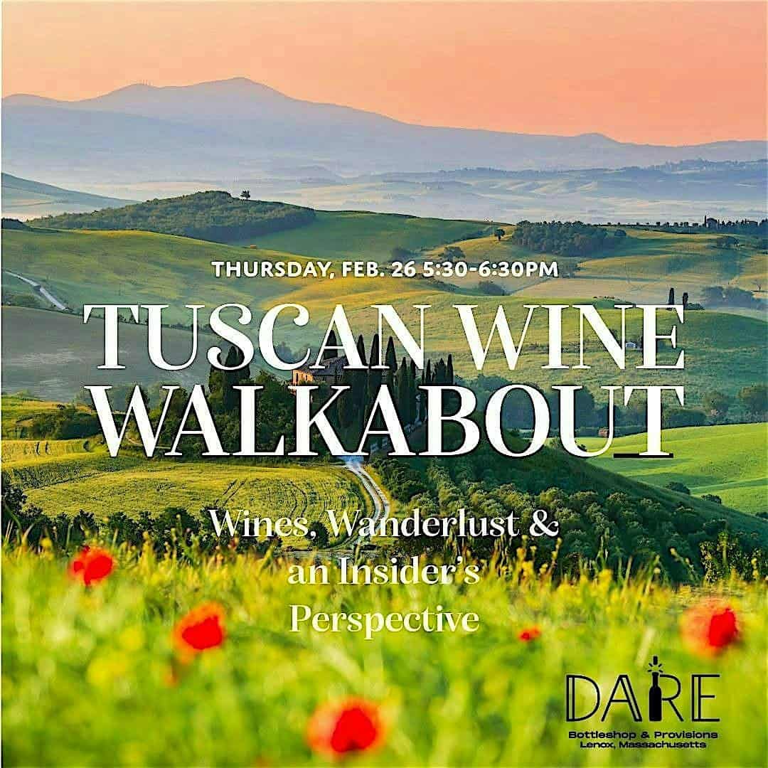 by admin14Feb Tuscan Wine Walkabout at Dare Bottleshop & Provisions – Lenox, MA Tuscan Wine Walkabout at Dare Bottleshop & Provisions – Lenox, MA 2 2 people viewed this event. Taste Tuscan wines + enjoy an evening with insider Stéphane Ferioli. Discover beloved local wineries—and the real Tuscany behind the bottle Tickets-RSVP Link Date And Time Thursday, February 26th, 2026 10:00 PM (PST) Venue Dare Bottleshop & Provisions Location 11 Housatonic Street, Lenox, MA 1240 Event Types Food & DrinkOther Event Category Massachusetts Share With Friends Facebook Twitter Linkedin Xing Pinterest Share This Post: