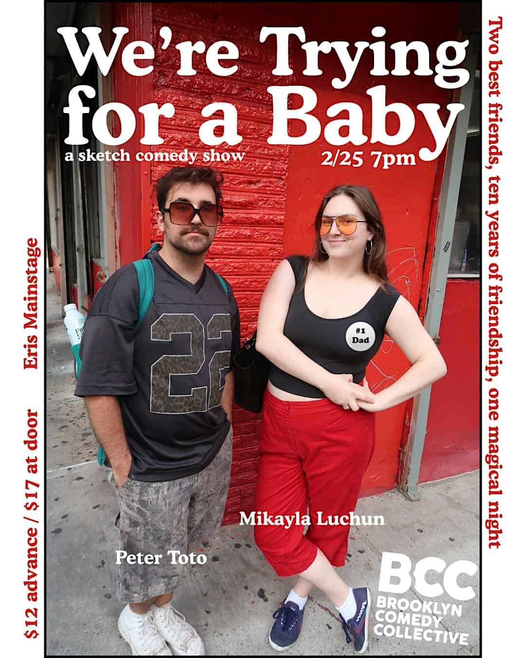 by admin14Feb We’re Trying for A Baby at Brooklyn Comedy Collective – Brooklyn, NY We’re Trying for A Baby at Brooklyn Comedy Collective – Brooklyn, NY 1 1 people viewed this event. The baby’s name you ask? One Hour of Sketch Comedy Luchun-Toto. Tickets-RSVP Link Date And Time Thursday, February 26th, 2026 12:00 AM (PST) Venue Brooklyn Comedy Collective Location 167 Graham Avenue, Brooklyn, NY 11206 Event Types Concert or PerformanceFilm, Media & Entertainment Event Category New York Share With Friends Facebook Twitter Linkedin Xing Pinterest Share This Post: