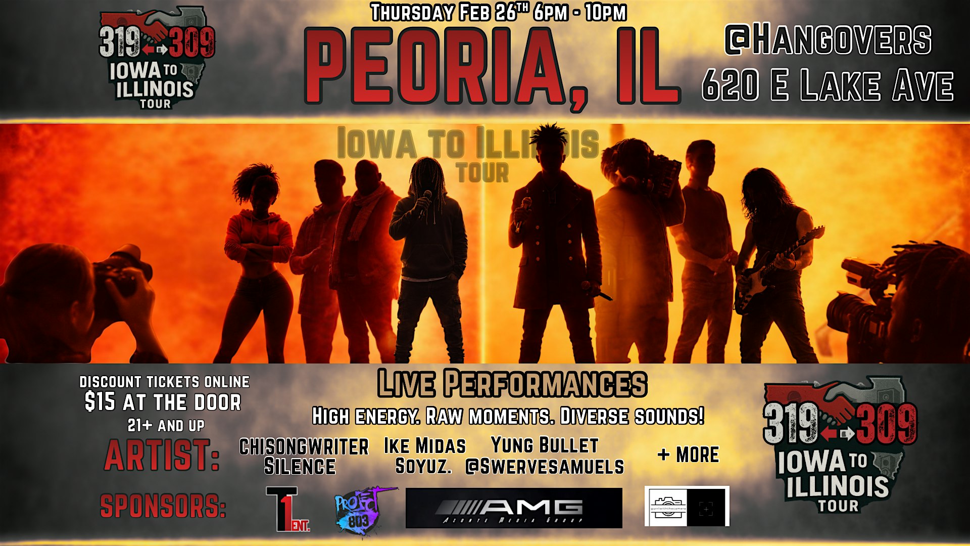 by admin13Feb 319 to 309 Tour: Peoria, IL Stop at Hangovers – Peoria, IL 319 to 309 Tour: Peoria, IL Stop at Hangovers – Peoria, IL 1 1 people viewed this event. The 319 to 309 Tour travels city to city across Iowa and Illinois to spotlight local artists, small businesses, and brands. Tickets-RSVP Link Date And Time Friday, February 27th, 2026 12:00 AM (PST) Venue Hangovers Location 629 East Lake Avenue, Peoria, IL 61614 Event Types Music Event Category Illinois Share With Friends Facebook Twitter Linkedin Xing Pinterest Share This Post: