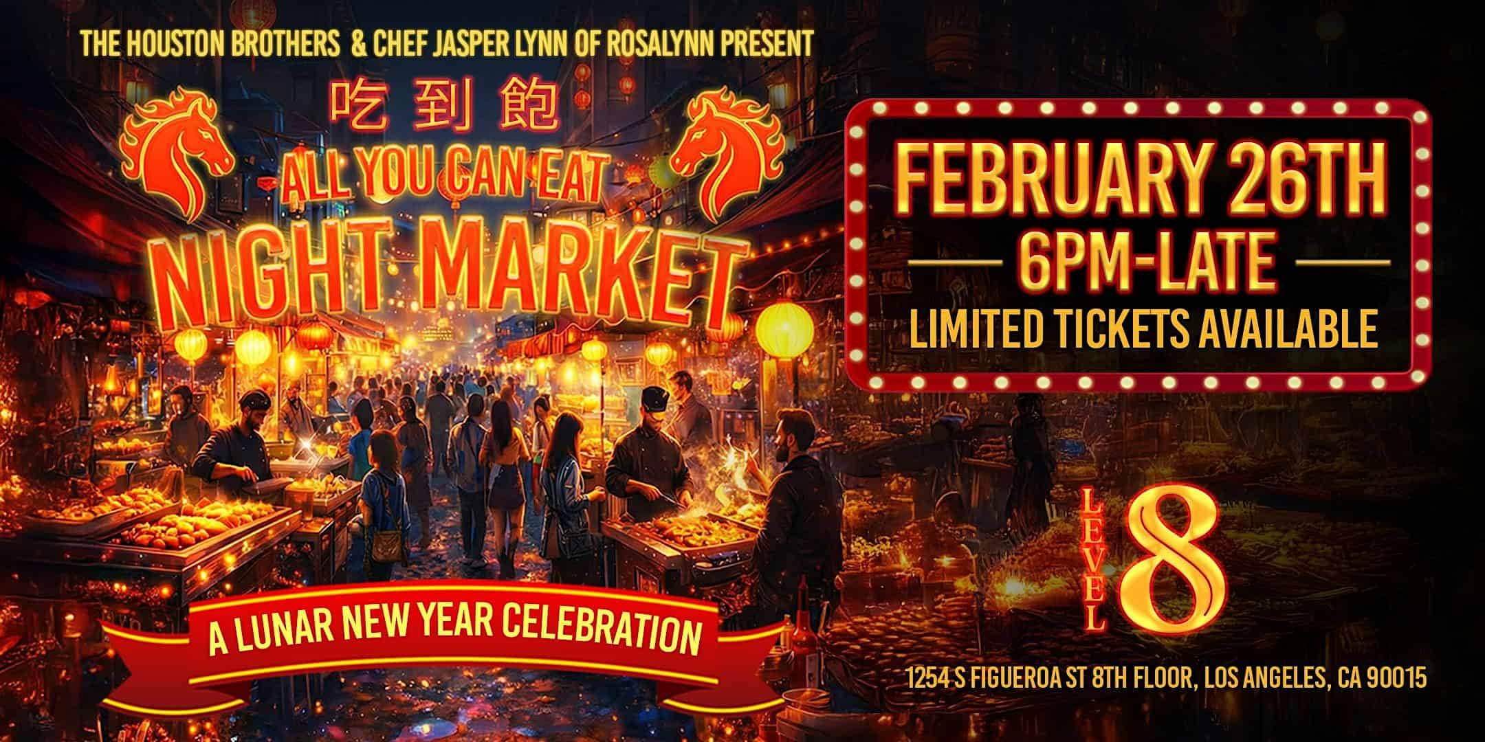 by admin14Feb All-You-Can-Eat Night Market | A Lunar New Year Celebration @ Level 8 DTLA at LEVEL 8 – Los Angeles, CA All-You-Can-Eat Night Market | A Lunar New Year Celebration @ Level 8 DTLA at LEVEL 8 – Los Angeles, CA 3 3 people viewed this event. This Lunar New Year, Level 8 partners with Chef Jasper Lynn—the creative force behind Supper Club Rosalynn. Tickets-RSVP Link Date And Time Friday, February 27th, 2026 02:00 AM (PST) Venue LEVEL 8 Location 1254 South Figueroa Street, Los Angeles, CA 90015 Event Types Festival or FairFood & Drink Event Category CaliforniaLos Angeles Share With Friends Facebook Twitter Linkedin Xing Pinterest Share This Post: