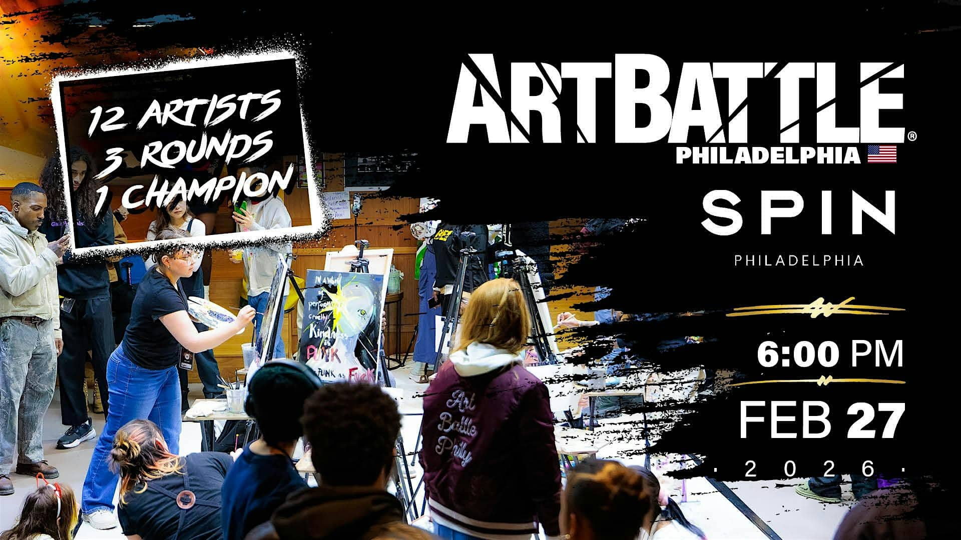 by admin14Feb Art Battle Philadelphia – February 27, 2026 at SPIN Philadelphia – Philadelphia, PA Art Battle Philadelphia – February 27, 2026 at SPIN Philadelphia – Philadelphia, PA 2 2 people viewed this event. Art in motion. You choose the winner! Tickets-RSVP Link Date And Time Friday, February 27th, 2026 11:00 PM (PST) Venue SPIN Philadelphia Location 211 South 15th Street, Philadelphia, PA 19102 Event Types Concert or PerformancePerforming & Visual Arts Event Category PennsylvaniaPhiladelphia Share With Friends Facebook Twitter Linkedin Xing Pinterest Share This Post: