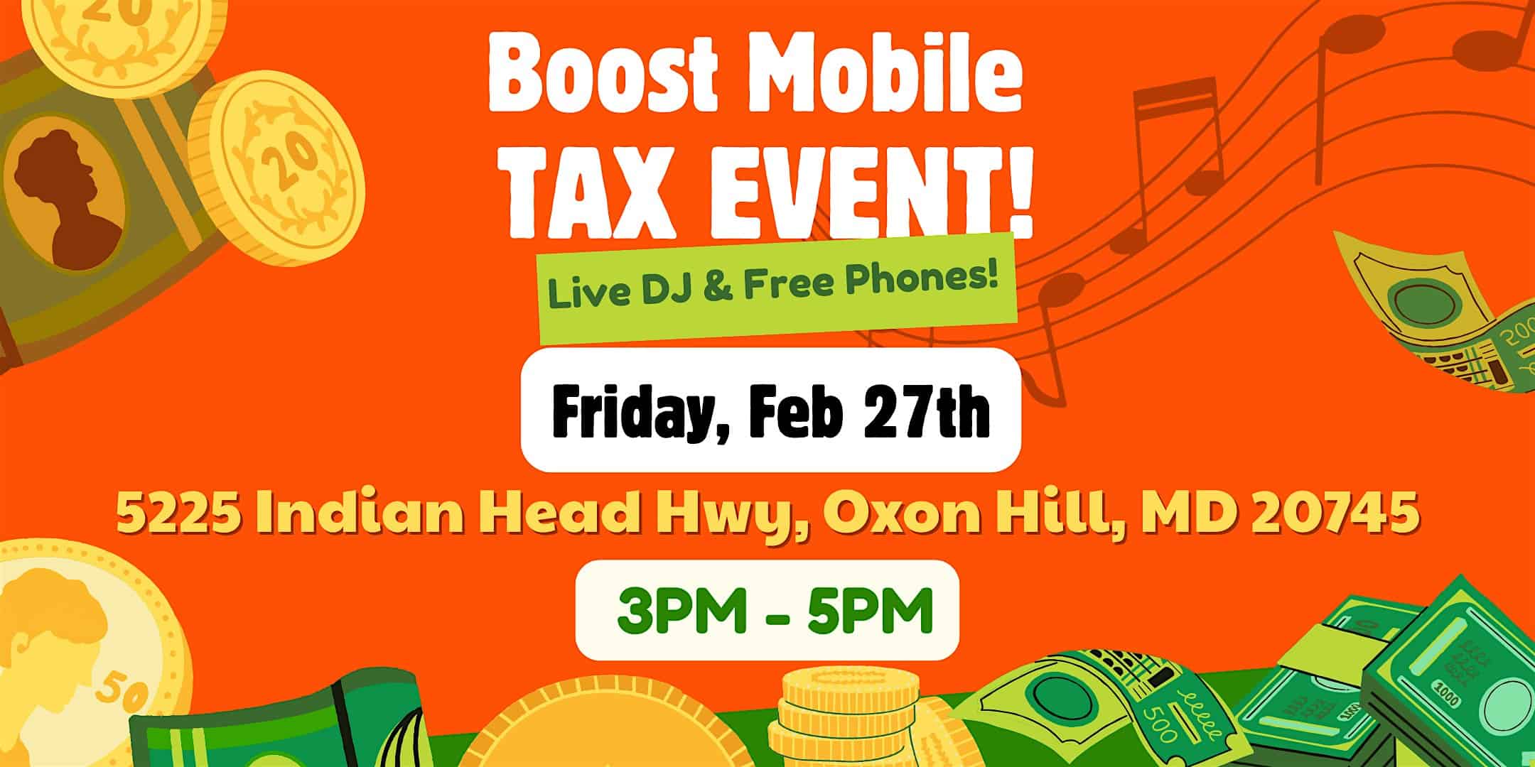 by admin14Feb Big Tax Season Event — Only at Boost Mobile! at 5225 Indian Head Hwy – Oxon Hill, MD Big Tax Season Event — Only at Boost Mobile! at 5225 Indian Head Hwy – Oxon Hill, MD 3 3 people viewed this event. Score sweet Boost Mobile deals and get your tax season boost – only in-store, don’t miss out! Tickets-RSVP Link Date And Time Friday, February 27th, 2026 08:00 PM (PST) Venue 5225 Indian Head Hwy Location 5225 Indian Head Highway, Oxon Hill, MD 20745 Event Types Party or Social Gathering Event Category MarylandNational Harbor Share With Friends Facebook Twitter Linkedin Xing Pinterest Share This Post: