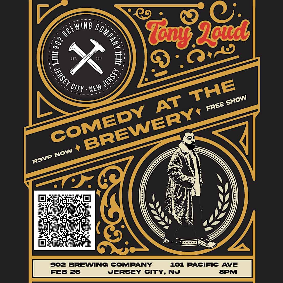 by admin14Feb Comedy at The Brewery at 902 Brewing Co . – Jersey City, NJ Comedy at The Brewery at 902 Brewing Co . – Jersey City, NJ 2 2 people viewed this event. Laughs on Tap at 902 Brewery Co. — February 26! Get ready, Jersey City — comedy is brewing! Join us Thursday, February 26, 2026 at 8PM Tickets-RSVP Link Date And Time Friday, February 27th, 2026 01:00 AM (PST) Venue 902 Brewing Co . Location 101 Pacific Avenue, Jersey City, NJ 7304 Event Types Concert or PerformancePerforming & Visual Arts Event Category New Jersey Share With Friends Facebook Twitter Linkedin Xing Pinterest Share This Post: