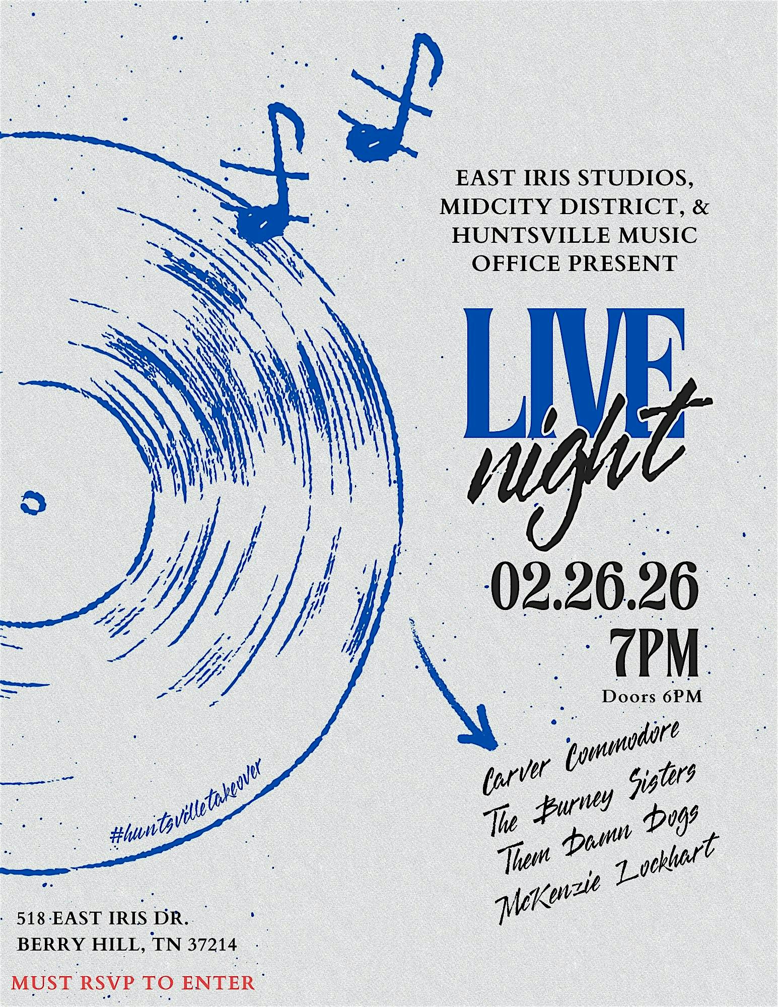 by admin13Feb East Iris Studios Present…Huntsville Invasion LIVE NIGHT! at 518 E Iris Dr – Nashville, TN East Iris Studios Present…Huntsville Invasion LIVE NIGHT! at 518 E Iris Dr – Nashville, TN 1 1 people viewed this event. Get ready for epic battles and wild fun at Huntsville Invasion LIVE NIGHT – where legends come alive! Tickets-RSVP Link Date And Time Friday, February 27th, 2026 12:00 AM (PST) Venue 518 E Iris Dr Location 518 East Iris Drive, Nashville, TN 37204 Event Types Concert or PerformanceMusic Event Category NashvilleTennessee Share With Friends Facebook Twitter Linkedin Xing Pinterest Share This Post: