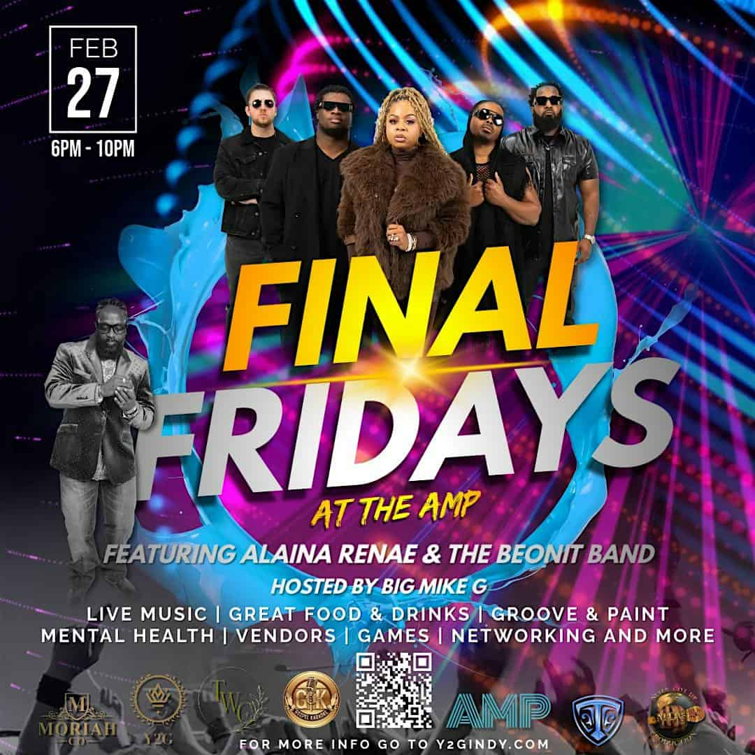 by admin14Feb Final Fridays at The AMP – Featuring Alaina Renae & The Beonit Band at The AMP at 16 Tech – Indianapolis, IN Final Fridays at The AMP – Featuring Alaina Renae & The Beonit Band at The AMP at 16 Tech – Indianapolis, IN 3 3 people viewed this event. Get ready to turn up the energy and kick off your weekend right at Final Fridays at The AMP! Tickets-RSVP Link Date And Time Friday, February 27th, 2026 11:00 PM (PST) Venue The AMP at 16 Tech Location 1220 Waterway Boulevard, Indianapolis, IN 46202 Event Types Community & CultureConcert or Performance Event Category IndianaIndianapolis Share With Friends Facebook Twitter Linkedin Xing Pinterest Share This Post: