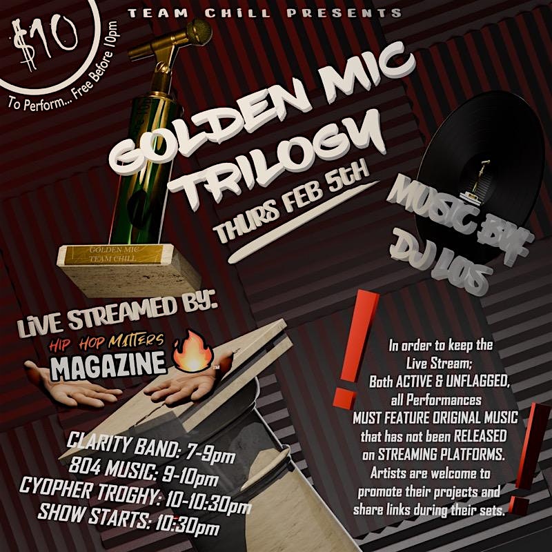 by admin13Feb Golden Mic Trilogy at Satellite Restaurant – Richmond, VA Golden Mic Trilogy at Satellite Restaurant – Richmond, VA 2 2 people viewed this event. The longest running showcase in VA history is back. The Golden Mic Trilogy… come out and be apart of the movement and we writing the script Tickets-RSVP Link Date And Time Friday, February 27th, 2026 12:00 AM (PST) Venue Satellite Restaurant Location 4000 Richmond Highway, Richmond, VA 23234 Event Types Concert or PerformanceMusic Event Category Virginia Share With Friends Facebook Twitter Linkedin Xing Pinterest Share This Post: