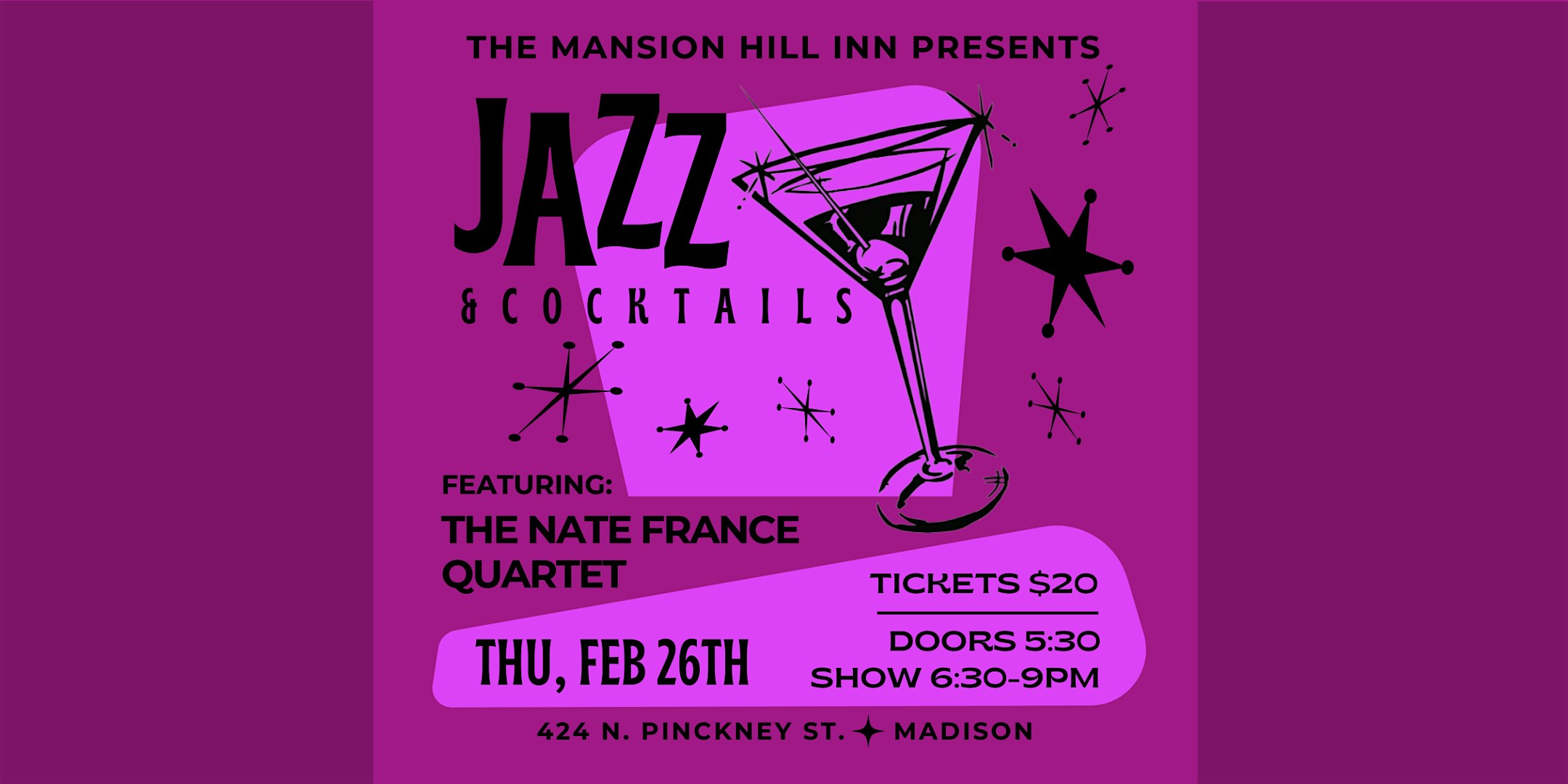 by admin13Feb Jazz & Cocktails Featuring the Nate France Quartet at Mansion Hill Inn – Madison, WI Jazz & Cocktails Featuring the Nate France Quartet at Mansion Hill Inn – Madison, WI 1 1 people viewed this event. Join us for an evening of jazz & R&B standards with the Nate France Quartet Tickets-RSVP Link Date And Time Friday, February 27th, 2026 12:00 AM (PST) Venue Mansion Hill Inn Location 424 North Pinckney Street, Madison, WI 53703 Event Types Concert or PerformanceMusic Event Category Wisconsin Share With Friends Facebook Twitter Linkedin Xing Pinterest Share This Post: