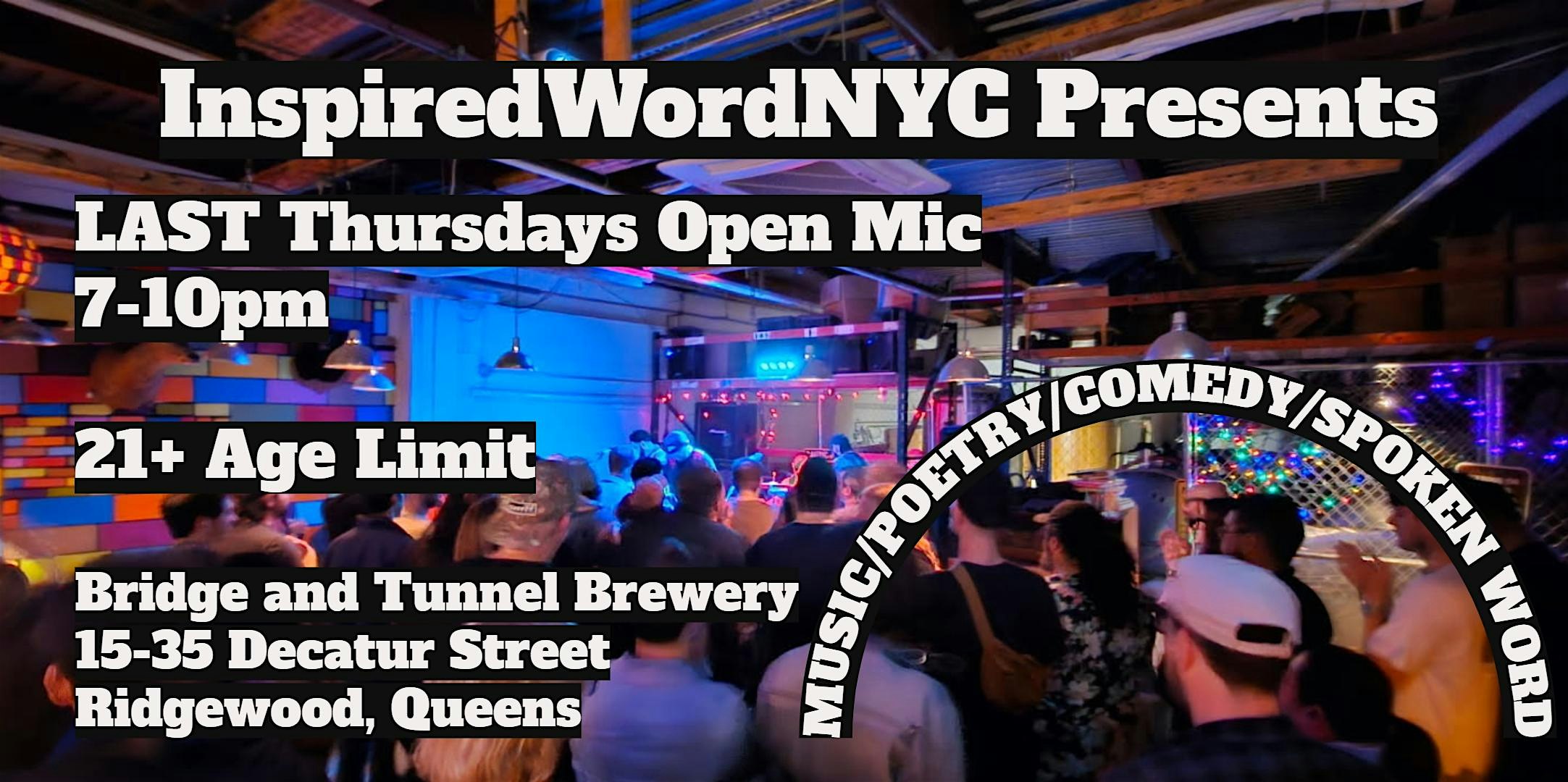 by admin13Feb Last Thursdays Open Mic at Bridge and Tunnel Brewery at Bridge and Tunnel Brewery – Queens, NY Last Thursdays Open Mic at Bridge and Tunnel Brewery at Bridge and Tunnel Brewery – Queens, NY 1 1 people viewed this event. Last Thursdays Open Mic at Bridge and Tunnel Brewery in Ridgewood, Queens Tickets-RSVP Link Date And Time Friday, February 27th, 2026 12:00 AM (PST) Venue Bridge and Tunnel Brewery Location 15-35 Decatur Street, Queens, NY 11385 Event Types Concert or PerformanceMusic Event Category New YorkNew York City Share With Friends Facebook Twitter Linkedin Xing Pinterest Share This Post: