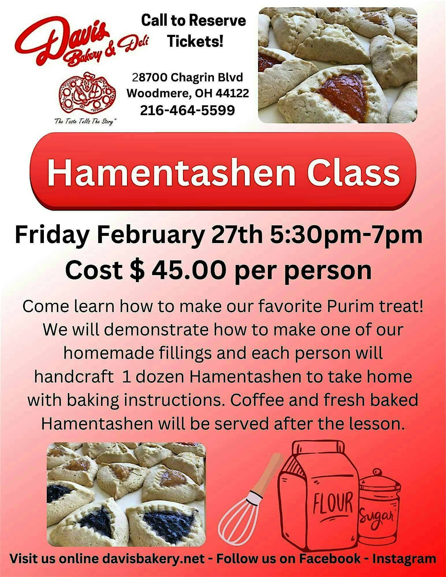 by admin14Feb Make and Take Hamentashen Class at Davis Bakery & Delicatessen – Woodmere, OH Make and Take Hamentashen Class at Davis Bakery & Delicatessen – Woodmere, OH 1 1 people viewed this event. Come and learn how to make our favorite Purim treat, Hamentashen! Tickets-RSVP Link Date And Time Friday, February 27th, 2026 10:00 PM (PST) Venue Davis Bakery & Delicatessen Location 28700 Chagrin Boulevard, Woodmere, OH 44122 Event Types Food & Drink Event Category Ohio Share With Friends Facebook Twitter Linkedin Xing Pinterest Share This Post: