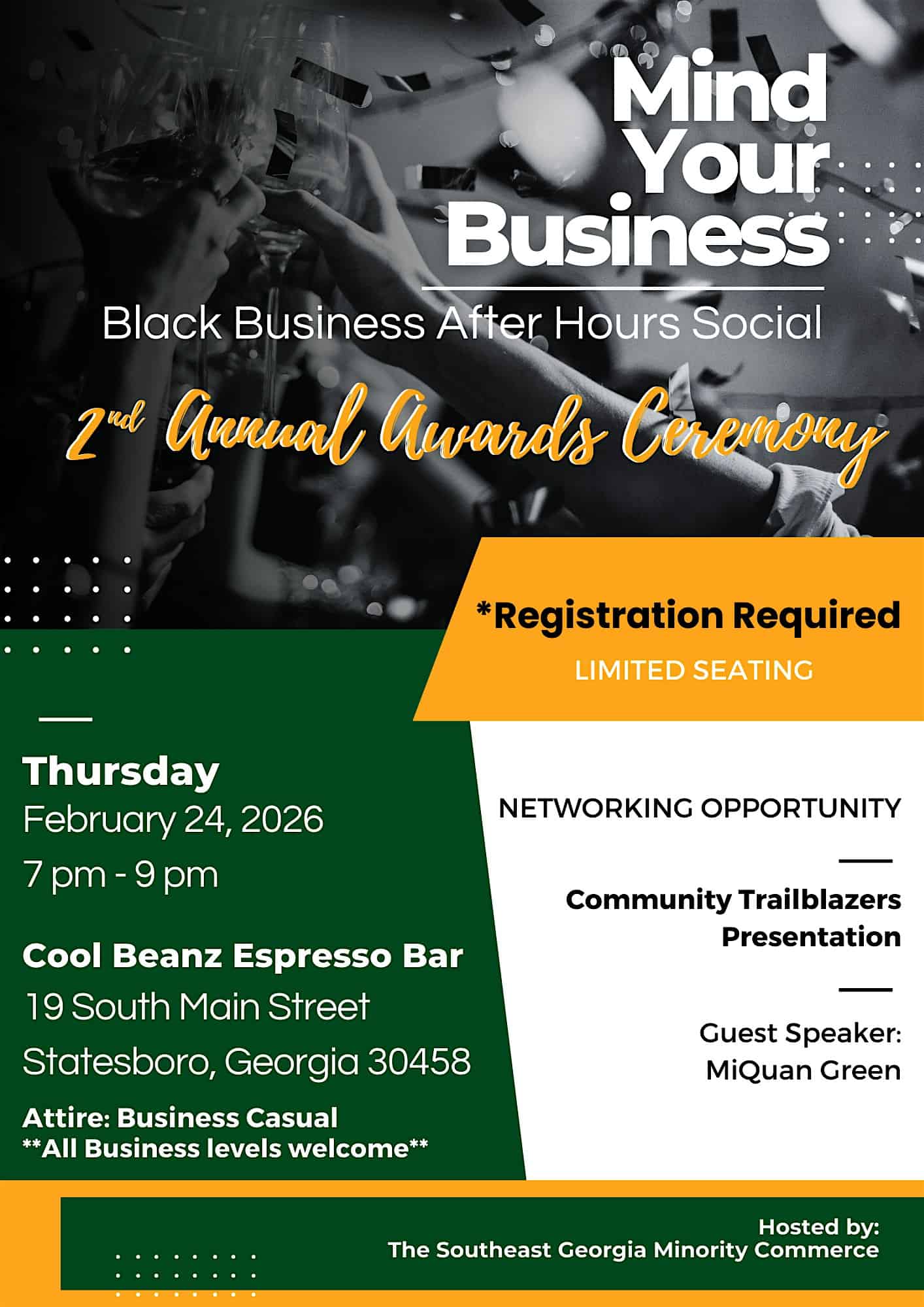 by admin14Feb Mind Your Business | Black Business After Hours Social at Cool Beanz Espresso Bar – Statesboro, GA Mind Your Business | Black Business After Hours Social at Cool Beanz Espresso Bar – Statesboro, GA 1 1 people viewed this event. Come celebrate Mind Your Business 2nd Annual Awards Ceremony with us at our After Hours Social – a night of networking, support, and fun. Tickets-RSVP Link Date And Time Friday, February 27th, 2026 12:00 AM (PST) Venue Cool Beanz Espresso Bar Location 19 South Main Street, Statesboro, GA 30458 Event Types Party or Social Gathering Event Category Georgia Share With Friends Facebook Twitter Linkedin Xing Pinterest Share This Post: