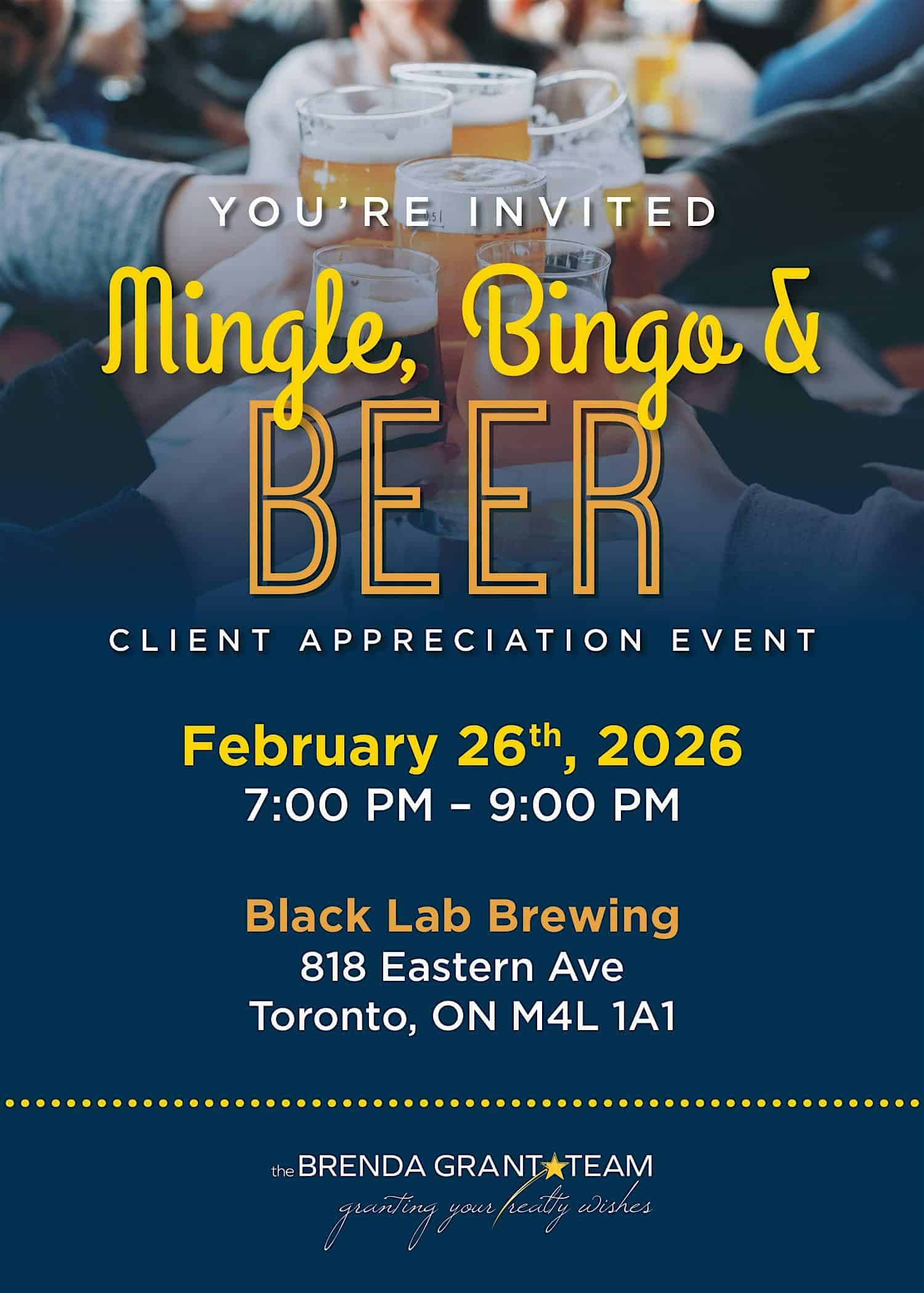 by admin14Feb Mingle, Bingo & Beer with The Brenda Grant Team at 818 Eastern Ave – Toronto, ON Mingle, Bingo & Beer with The Brenda Grant Team at 818 Eastern Ave – Toronto, ON 2 2 people viewed this event. You’re invited to a fun, laid-back client appreciation night to mingle, catch up and enjoy great beer in a relaxed social setting. Tickets-RSVP Link Date And Time Friday, February 27th, 2026 12:00 AM (PST) Venue 818 Eastern Ave Location 818 Eastern Avenue, Toronto, ON M4L 1A1 Event Types Food & DrinkParty or Social Gathering Share With Friends Facebook Twitter Linkedin Xing Pinterest Share This Post: