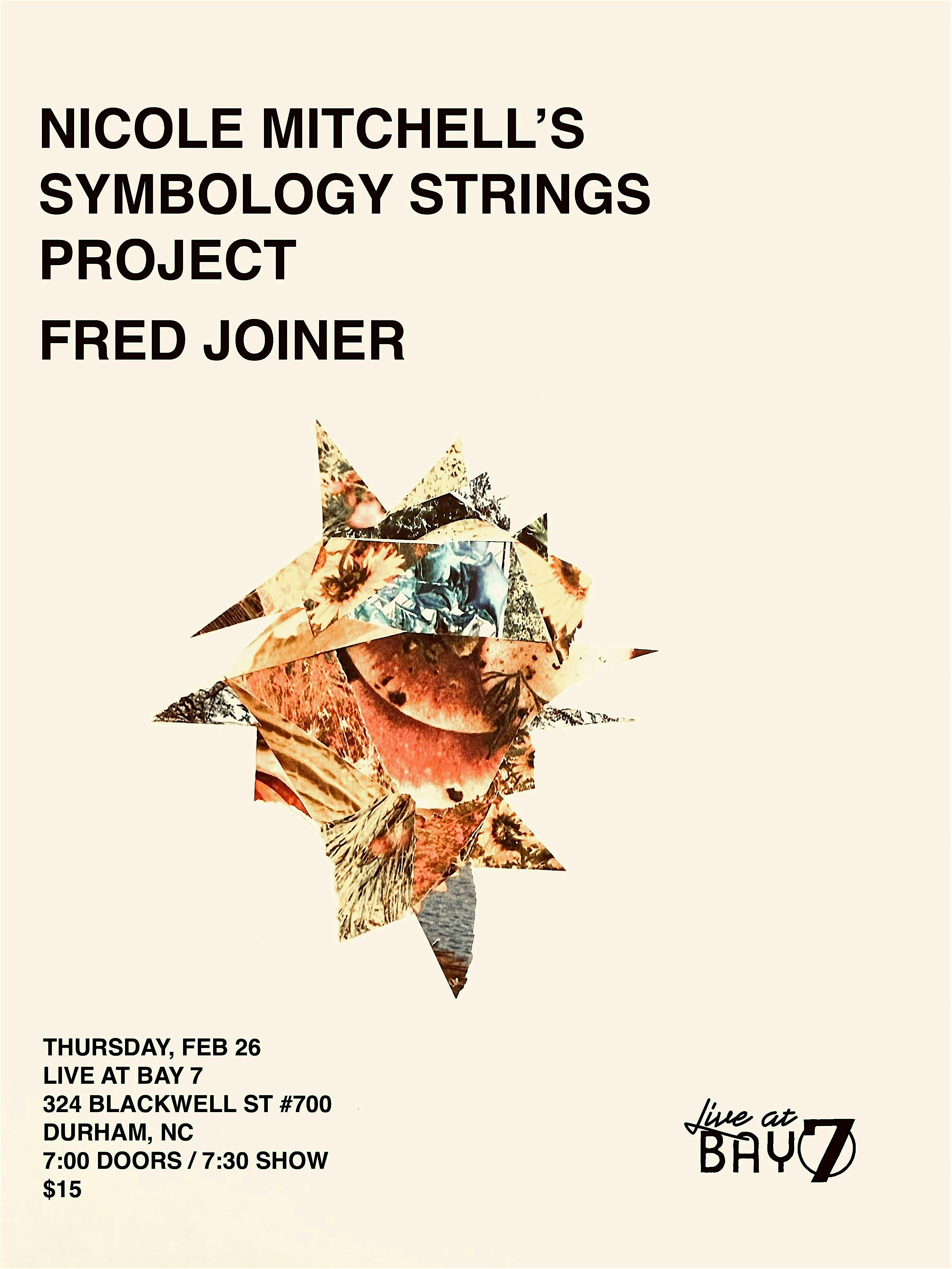 by admin13Feb Music at Bay 7 – Nicole Mitchell’s Symbology Strings Project, Fred L.Joiner at Bay 7 – Durham, NC Music at Bay 7 – Nicole Mitchell’s Symbology Strings Project, Fred L.Joiner at Bay 7 – Durham, NC 2 2 people viewed this event. Live at Bay 7 welcomes Nicole Mitchell’s Symbology Strings Project and Fred L. Joiner for a night of music and poetry. Tickets-RSVP Link Date And Time Friday, February 27th, 2026 12:00 AM (PST) Venue Bay 7 Location 324 Blackwell Street, Durham, NC 27701 Event Types Concert or PerformanceMusic Event Category DurhamNorth Carolina Share With Friends Facebook Twitter Linkedin Xing Pinterest Share This Post: