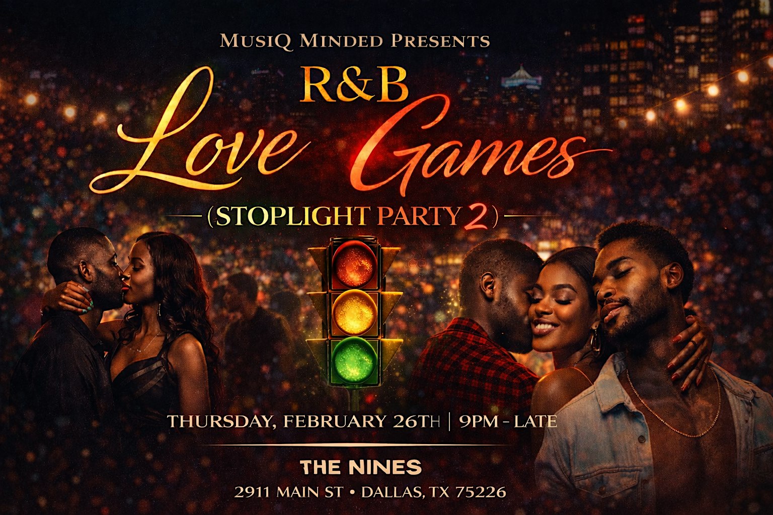 by admin13Feb MusiQ Minded Presents: R&B Love Games (Stoplight Party 2) at The Nines – Dallas, TX MusiQ Minded Presents: R&B Love Games (Stoplight Party 2) at The Nines – Dallas, TX 1 1 people viewed this event. The R&B Love Games is here. A flirty Stoplight Party with real vibes, good music, and grown energy. Free entry. Choose your color wisely. ❤️ Tickets-RSVP Link Date And Time Friday, February 27th, 2026 03:00 AM (PST) Venue The Nines Location 2911 Main Street, Dallas, TX 75226 Event Types MusicParty or Social Gathering Event Category DallasTexas Share With Friends Facebook Twitter Linkedin Xing Pinterest Share This Post: