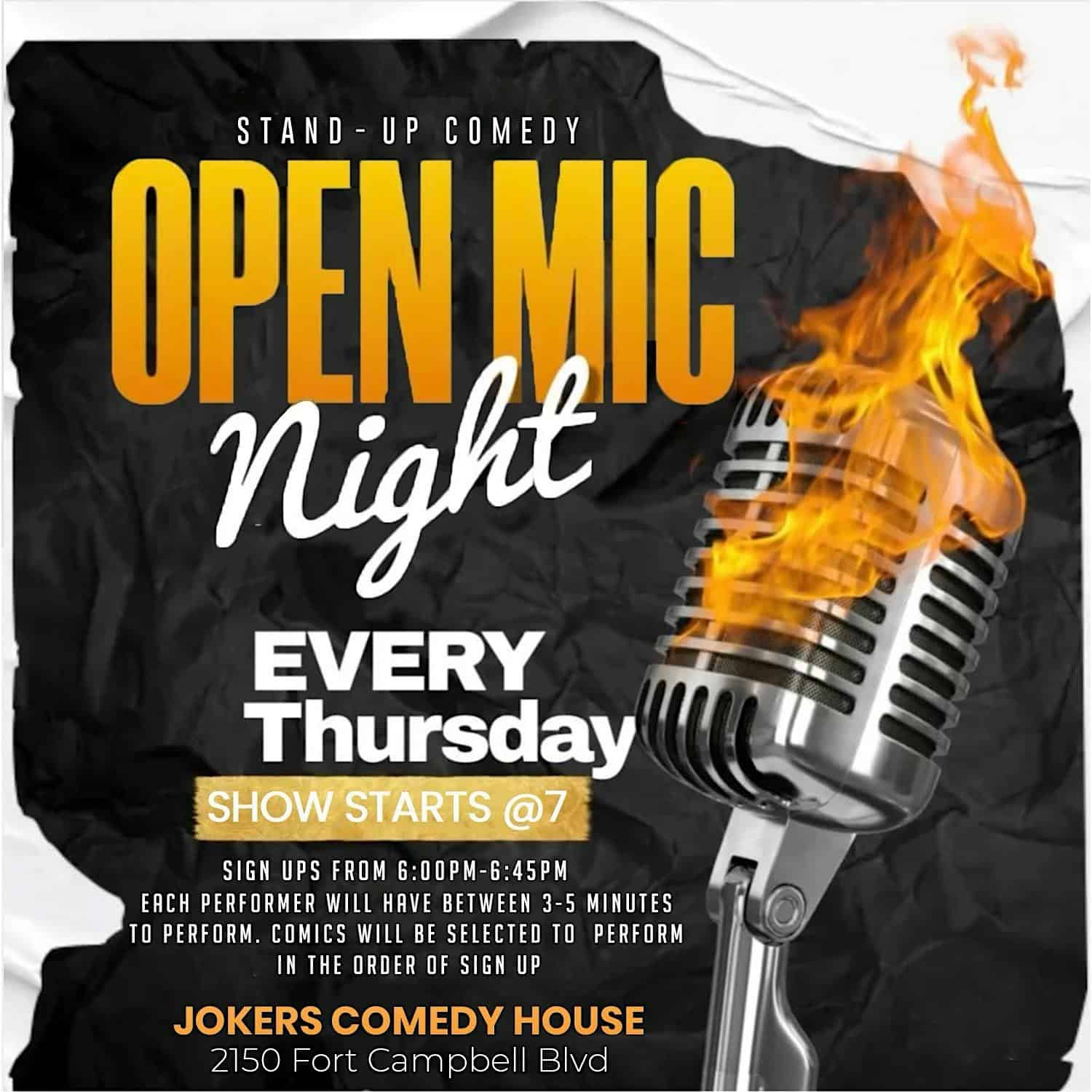 by admin14Feb Open Mic Nights at Joker’s Comedy House – Clarksville, TN Open Mic Nights at Joker’s Comedy House – Clarksville, TN 2 2 people viewed this event. Whether you’re an aspiring comedian or just want to enjoy some great performances. Come on down to Jokers Comedy House for our Open Mic! Tickets-RSVP Link Date And Time Friday, February 27th, 2026 01:00 AM (PST) Venue Joker's Comedy House Location 2150 Fort Campbell Boulevard, Clarksville, TN 37042 Event Types Concert or PerformancePerforming & Visual Arts Event Category Tennessee Share With Friends Facebook Twitter Linkedin Xing Pinterest Share This Post: