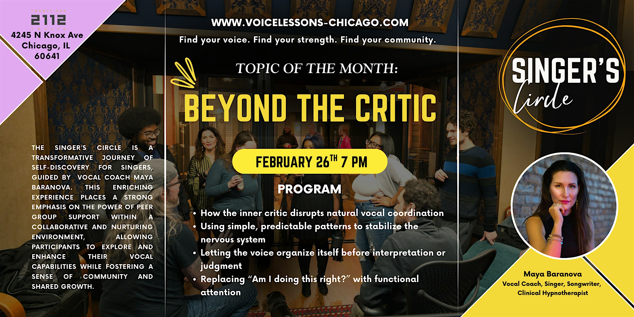 by admin13Feb Singer’s Circle: Beyond the Critic at 4245 N Knox Ave – Chicago, IL Singer’s Circle: Beyond the Critic at 4245 N Knox Ave – Chicago, IL 2 2 people viewed this event. A focused, supportive space for singers who want to understand how the inner critic interferes with vocal coordination. Tickets-RSVP Link Date And Time Friday, February 27th, 2026 01:00 AM (PST) Venue 4245 N Knox Ave Location 4245 North Knox Avenue, Chicago, IL 60641 Event Types Music Event Category ChicagoIllinois Share With Friends Facebook Twitter Linkedin Xing Pinterest Share This Post:
