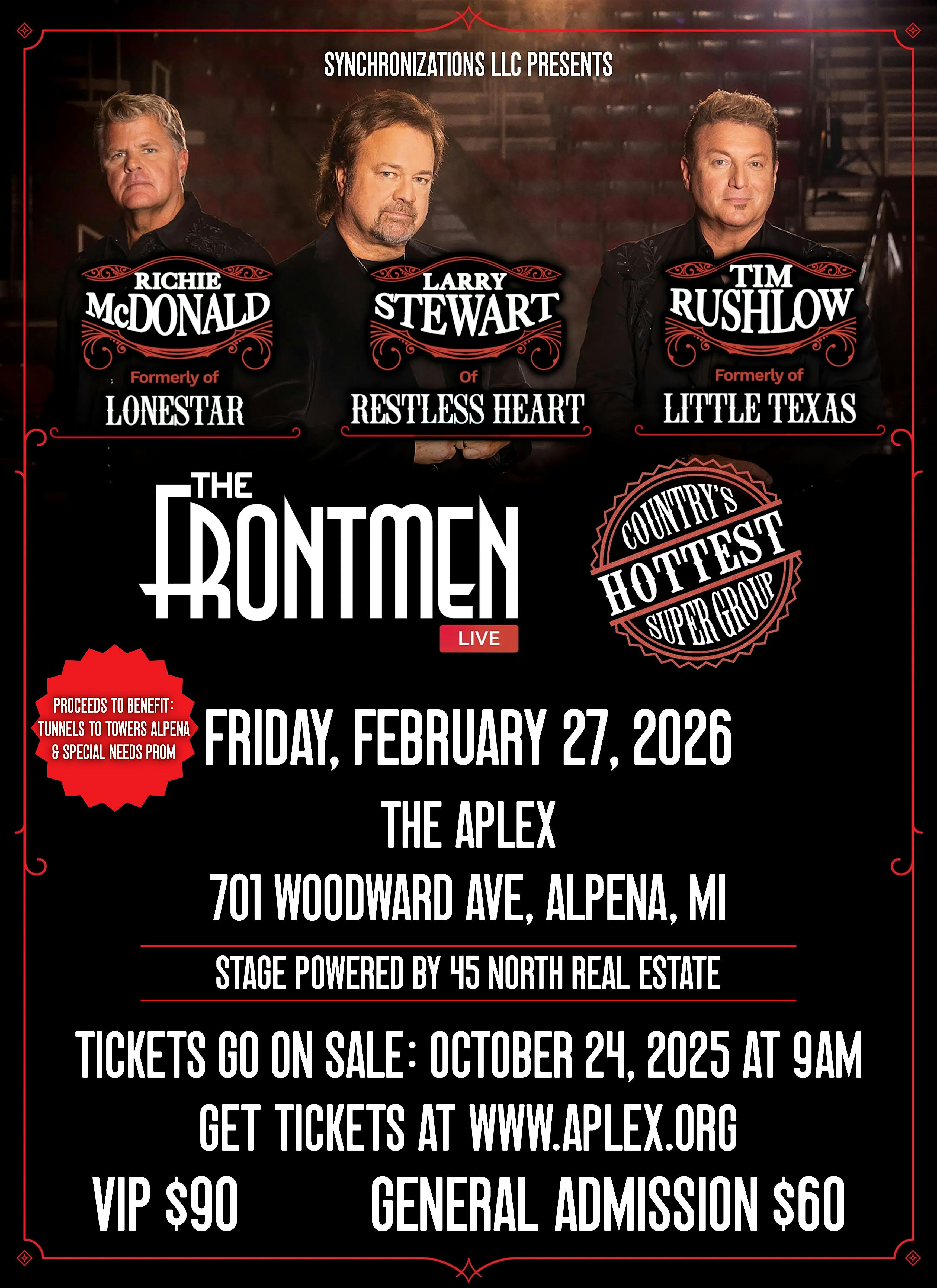 by admin13Feb The Frontmen: Richie McDonald, Larry Stewart & Tim Rushlow at Alpena Events Complex – Alpena, MI The Frontmen: Richie McDonald, Larry Stewart & Tim Rushlow at Alpena Events Complex – Alpena, MI 1 1 people viewed this event. Get ready to rock with The Frontmen as they bring their memorable country music hits to Alpena, MI! Tickets-RSVP Link Date And Time Friday, February 27th, 2026 10:00 PM (PST) Venue Alpena Events Complex Location 701 Woodward Avenue, Alpena, MI 49707 Event Types Concert or PerformanceMusic Event Category Michigan Share With Friends Facebook Twitter Linkedin Xing Pinterest Share This Post: