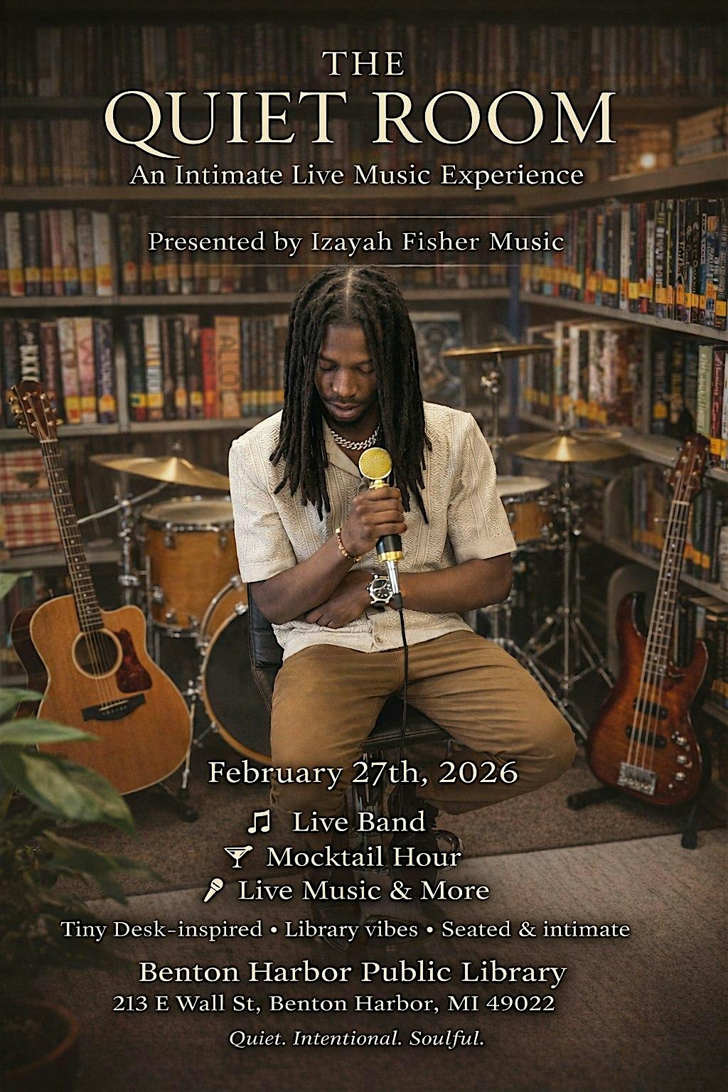 by admin13Feb THE QUIET ROOM ( An intimate live music experience) at Benton Harbor Public Library – Benton Harbor, MI THE QUIET ROOM ( An intimate live music experience) at Benton Harbor Public Library – Benton Harbor, MI 1 1 people viewed this event. An intimate live music experience. Inspired by the Tiny Desk vibe, but rooted right here at the library. ✨ Live Band Mocktail Hr, & More! Tickets-RSVP Link Date And Time Friday, February 27th, 2026 11:00 PM (PST) Venue Benton Harbor Public Library Location 213 East Wall Street, Benton Harbor, MI 49022 Event Types Concert or PerformanceMusic Event Category Michigan Share With Friends Facebook Twitter Linkedin Xing Pinterest Share This Post:
