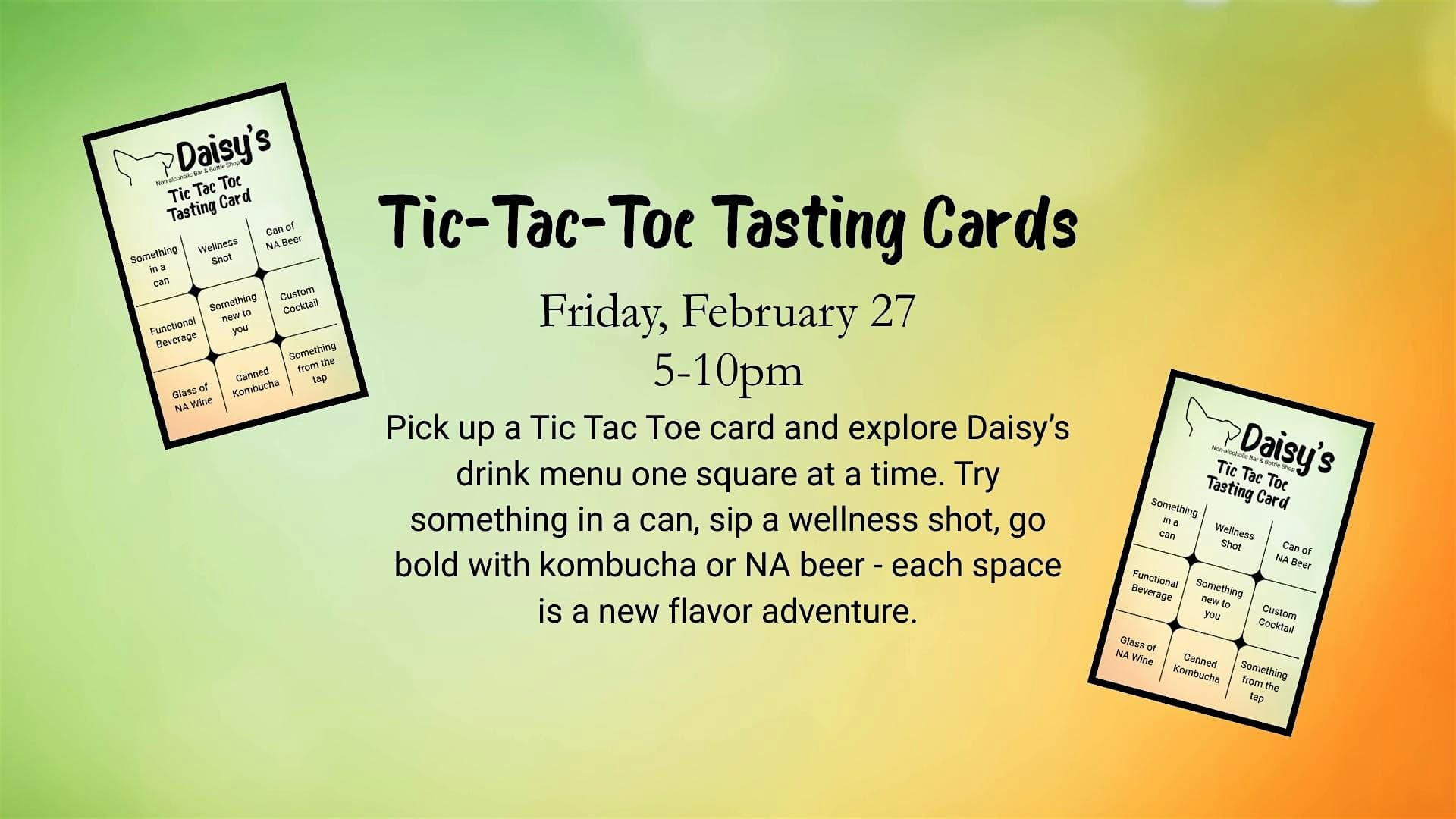 by admin14Feb Tic Tac Toe Tasting Cards at Daisy’s Non-alcoholic Bar and Bottle Shop – Maryville, TN Tic Tac Toe Tasting Cards at Daisy’s Non-alcoholic Bar and Bottle Shop – Maryville, TN 1 1 people viewed this event. Come taste your way through fun combos with Tic Tac Toe Tasting Cards — game on, snacks on! Tickets-RSVP Link Date And Time Friday, February 27th, 2026 10:00 PM (PST) Venue Daisy's Non-alcoholic Bar and Bottle Shop Location 608 Ellis Avenue, Maryville, TN 37803 Event Types Food & DrinkParty or Social Gathering Event Category Tennessee Share With Friends Facebook Twitter Linkedin Xing Pinterest Share This Post: