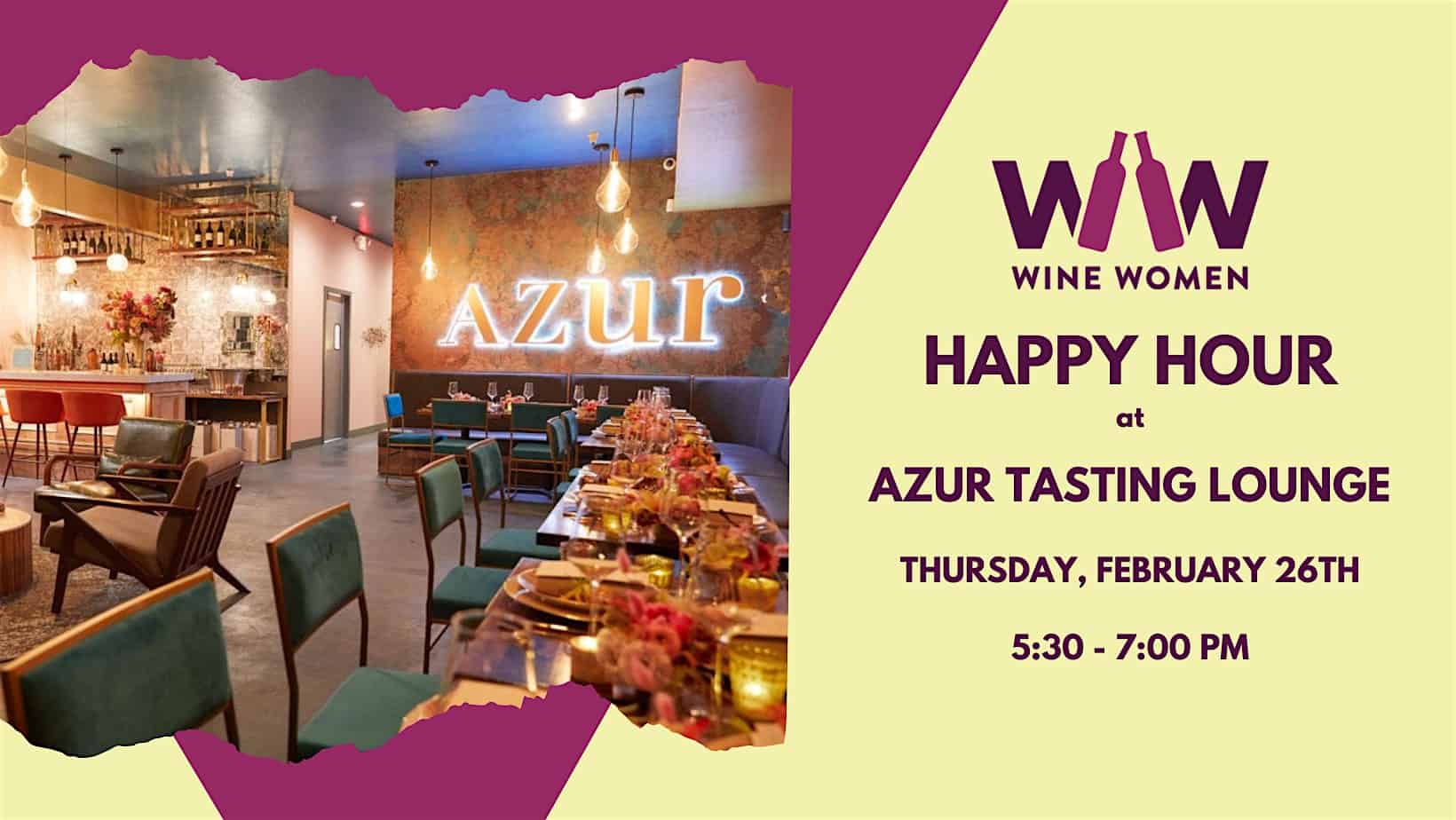 by admin14Feb WINE WOMEN Presents: Happy Hour at Azur Tasting Lounge at Azur Tasting Lounge – Napa, CA WINE WOMEN Presents: Happy Hour at Azur Tasting Lounge at Azur Tasting Lounge – Napa, CA 2 2 people viewed this event. Meet fellow wine professionals and enthusiasts as you sip Provencal-style Rose, premium Cabernet Sauvignon and Champagne! Tickets-RSVP Link Date And Time Friday, February 27th, 2026 01:00 AM (PST) Venue Azur Tasting Lounge Location 1014 Clinton Street, Napa, CA 94559 Event Types Food & DrinkParty or Social Gathering Event Category California Share With Friends Facebook Twitter Linkedin Xing Pinterest Share This Post: