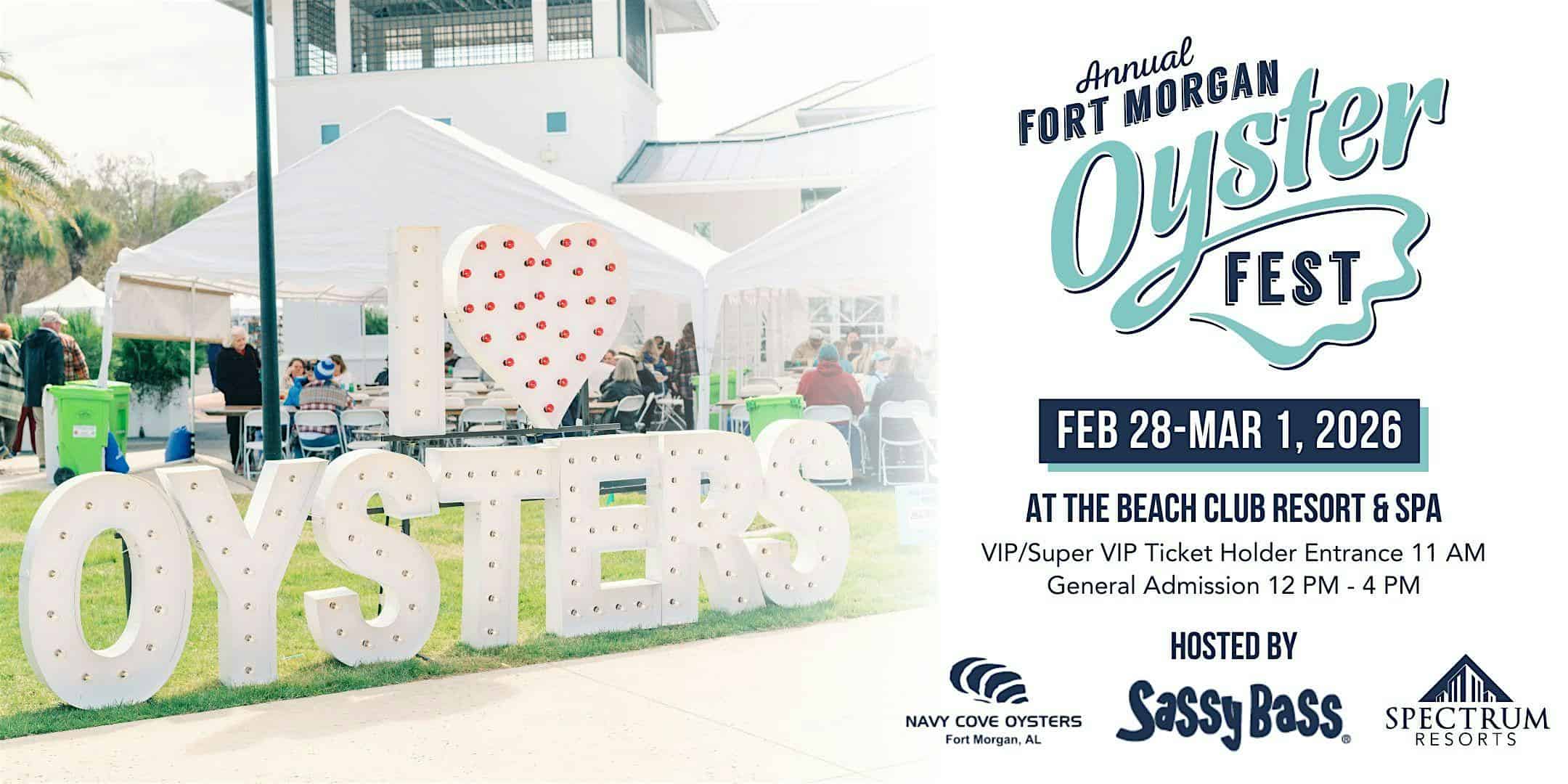 by admin14Feb 4th Annual Fort Morgan Oyster Fest at The Beach Club Resort & Spa – Gulf Shores, AL 4th Annual Fort Morgan Oyster Fest at The Beach Club Resort & Spa – Gulf Shores, AL 2 2 people viewed this event. Break to the beach Feb. 28 and March 1 for oyster-eating fun! Enjoy Fort Morgan oysters, live music, and arts/crafts vendors. Tickets-RSVP Link Date And Time Saturday, February 28th, 2026 06:00 PM (PST) Venue The Beach Club Resort & Spa Location 925 Beach Club Trail, Gulf Shores, AL 36542 Event Types Festival or FairFood & Drink Event Category Alabama Share With Friends Facebook Twitter Linkedin Xing Pinterest Share This Post: