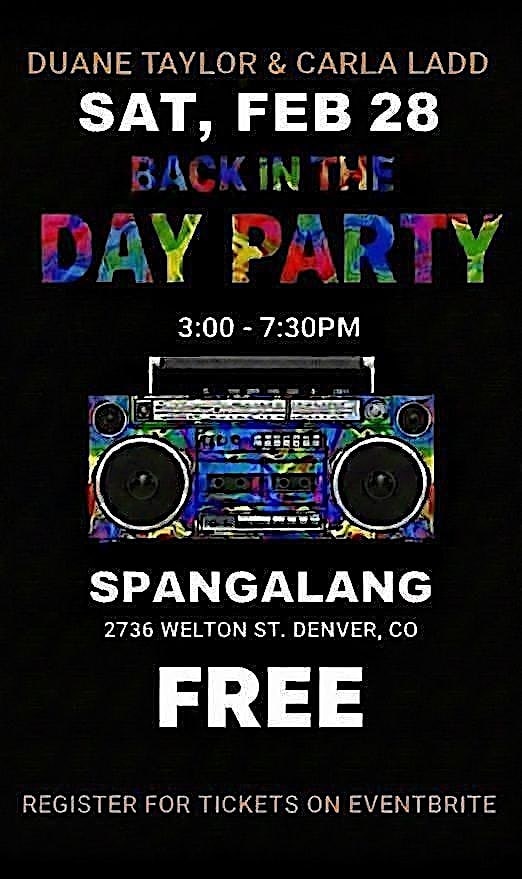 by admin14Feb Back in the “DAY” Party at “SPANGALANG” – Denver, CO Back in the “DAY” Party at “SPANGALANG” – Denver, CO 2 2 people viewed this event. Flashback Hip Hop, R&B Classics, Sing-alongs, Slides, Line Dances * The 2026 Little Black Book “Official” Release Event * FREE ADMISSION! Tickets-RSVP Link Date And Time Saturday, February 28th, 2026 10:00 PM (PST) Venue "SPANGALANG" Location 2736 Welton Street, Denver, CO 80205 Event Types MusicParty or Social Gathering Event Category ColoradoDenver Share With Friends Facebook Twitter Linkedin Xing Pinterest Share This Post: