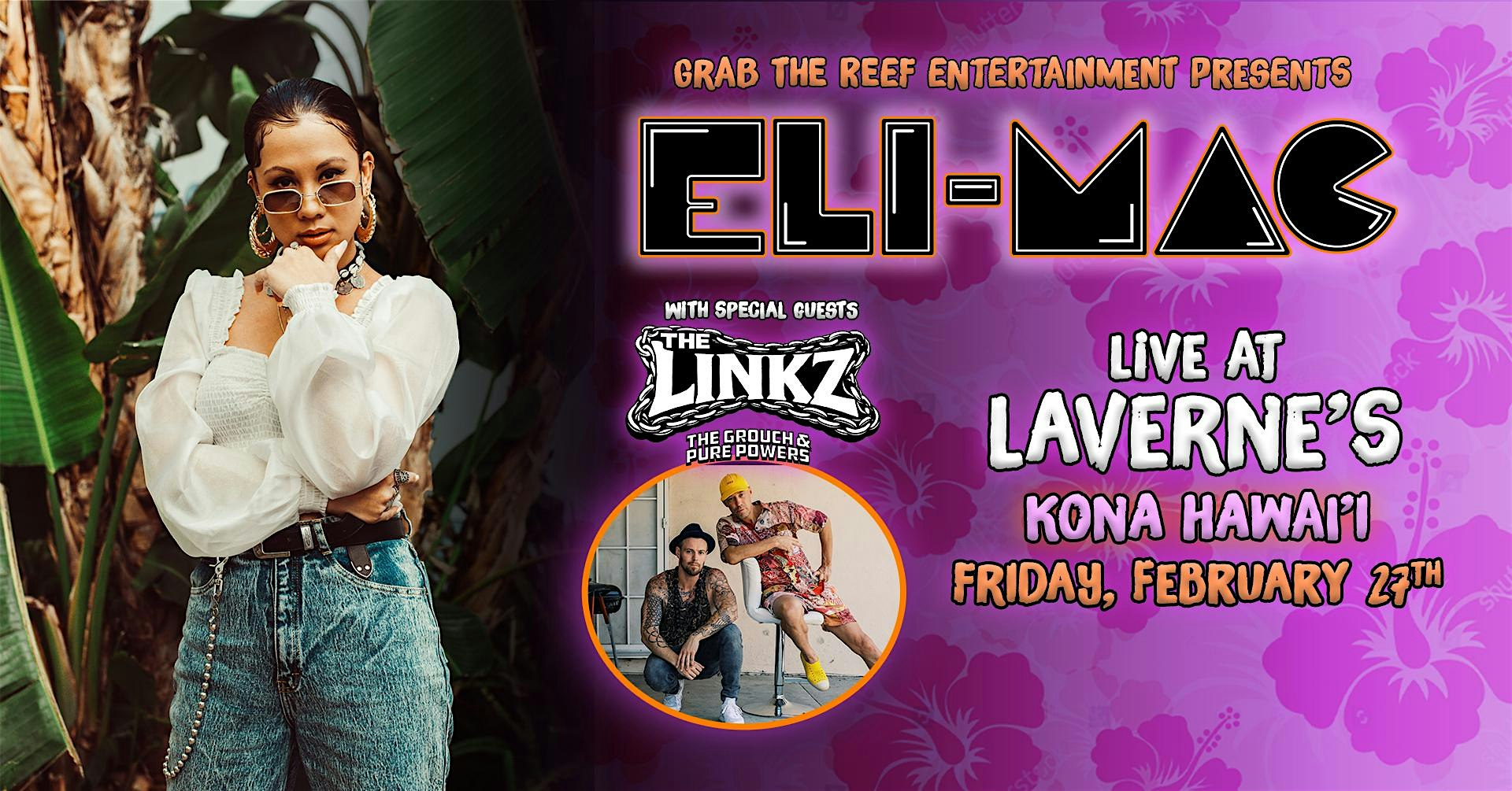 by admin13Feb Eli-Mac Live At Laverne’s at Laverne’s Sports Bar – Kailua-Kona, HI Eli-Mac Live At Laverne’s at Laverne’s Sports Bar – Kailua-Kona, HI 2 2 people viewed this event. Grab The Reef Entertainment Presents Eli-Mac Live At Lavererne’s With Special Guests The Linkz Friday February 27th Tickets-RSVP Link Date And Time Saturday, February 28th, 2026 05:00 AM (PST) Venue Laverne's Sports Bar Location 75-5819 Ali'i Drive, Kailua-Kona, HI 96740 Event Types Concert or PerformanceMusic Event Category Hawaii Share With Friends Facebook Twitter Linkedin Xing Pinterest Share This Post: