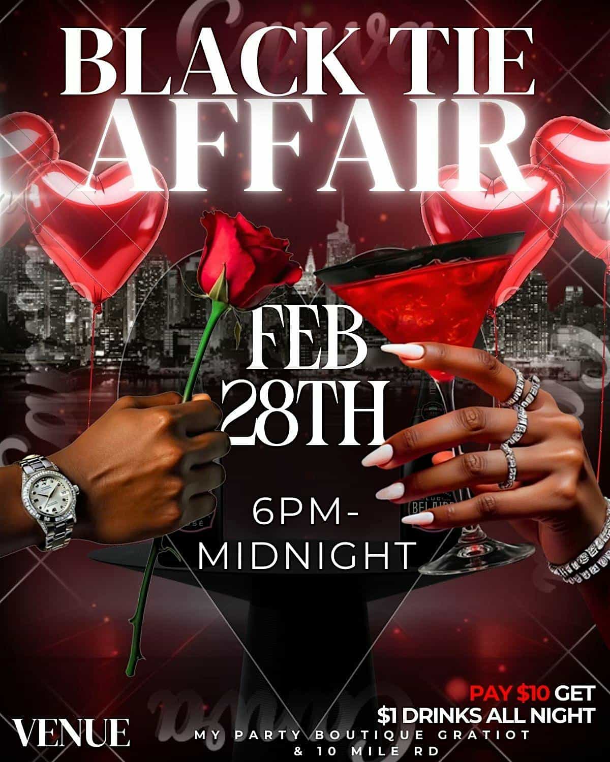 by admin14Feb Elite Status Valentine’s Day party at My party boutique – Eastpointe, MI Elite Status Valentine’s Day party at My party boutique – Eastpointe, MI 2 2 people viewed this event. Dress to impress for this Formal event. Evening gowns and tuxes $200 for hottest couple $100 for best dressed. Tickets-RSVP Link Date And Time Saturday, February 28th, 2026 11:00 PM (PST) Venue My party boutique Location 22211 Gratiot Avenue, Eastpointe, MI 48021 Event Types Party or Social GatheringSeasonal & Holiday Event Category Michigan Share With Friends Facebook Twitter Linkedin Xing Pinterest Share This Post: