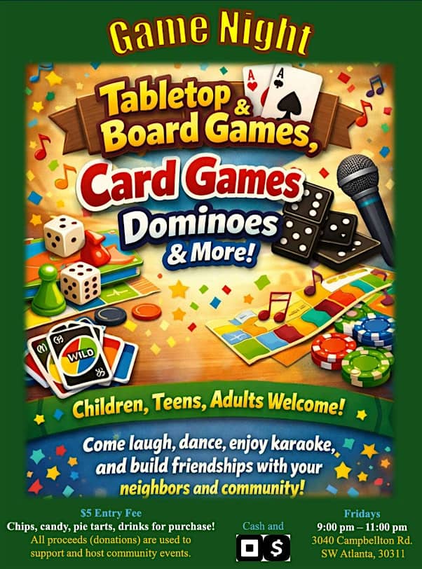by admin14Feb Family Game Night at 3040 Campbellton Rd SW – Atlanta, GA Family Game Night at 3040 Campbellton Rd SW – Atlanta, GA 2 2 people viewed this event. Join us every Friday for Game Night, where laughter, friendly competition, and community connection come together! Tickets-RSVP Link Date And Time Saturday, February 28th, 2026 02:00 AM (PST) Venue 3040 Campbellton Rd SW Location 3040 Campbellton Road Southwest, Atlanta, GA 30311 Event Types Community & CultureParty or Social Gathering Event Category AtlantaGeorgia Share With Friends Facebook Twitter Linkedin Xing Pinterest Share This Post: