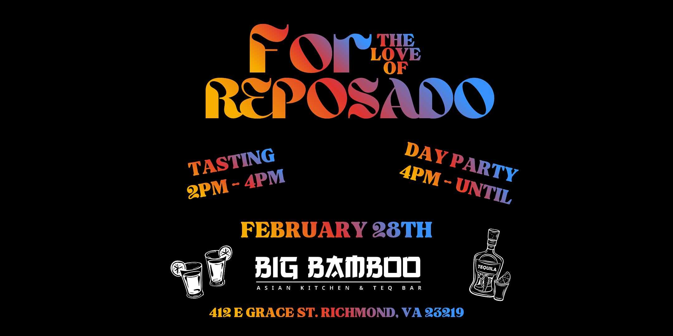 by admin14Feb For The Love Reposado at 412 E Grace St – Richmond, VA For The Love Reposado at 412 E Grace St – Richmond, VA 2 2 people viewed this event. This Big Bamboo Tequila Tasting will include sampling 4 of our smooth Reposado Tequilas paired perfectly with some of our handcrafted taco. Tickets-RSVP Link Date And Time Saturday, February 28th, 2026 07:00 PM (PST) Venue 412 E Grace St Location 412 East Grace Street, Richmond, VA 23219 Event Types Food & DrinkParty or Social Gathering Event Category Virginia Share With Friends Facebook Twitter Linkedin Xing Pinterest Share This Post: