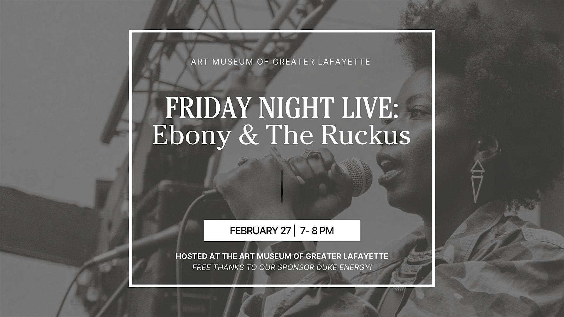 by admin13Feb Friday Night Live: Ebony and the Ruckus at Art Museum of Greater Lafayette – Lafayette, IN Friday Night Live: Ebony and the Ruckus at Art Museum of Greater Lafayette – Lafayette, IN 3 3 people viewed this event. We hope you’re ready to cause a ruckus with Ebony and friends! Tickets-RSVP Link Date And Time Saturday, February 28th, 2026 12:00 AM (PST) Venue Art Museum of Greater Lafayette Location 102 South 10th Street, Lafayette, IN 47905 Event Types Concert or PerformanceMusic Event Category Indiana Share With Friends Facebook Twitter Linkedin Xing Pinterest Share This Post: