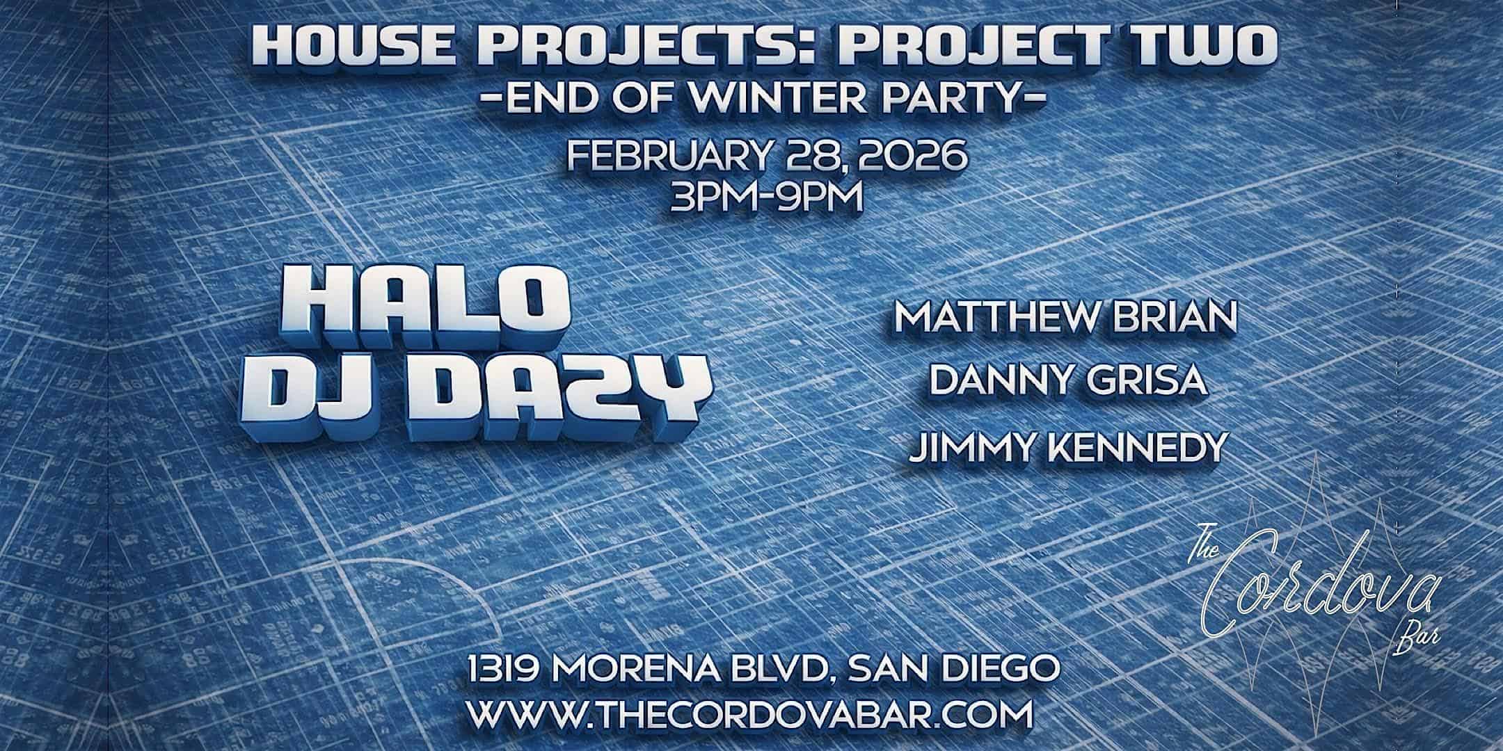 by admin14Feb House Projects Presents: Project 2 Featuring Halo & DJ Dazy at The Cordova Bar – San Diego, CA House Projects Presents: Project 2 Featuring Halo & DJ Dazy at The Cordova Bar – San Diego, CA 2 2 people viewed this event. House Projects returns to The Cordova Bar…featuring Halo and DJ Dazy with support by Danny Grisa, Matthew Brian, and Jimmy Kennedy! Tickets-RSVP Link Date And Time Saturday, February 28th, 2026 11:00 PM (PST) Venue The Cordova Bar Location 1319 Morena Boulevard, San Diego, CA 92110 Event Types Party or Social GatheringSeasonal & Holiday Event Category CaliforniaSan Diego Share With Friends Facebook Twitter Linkedin Xing Pinterest Share This Post: