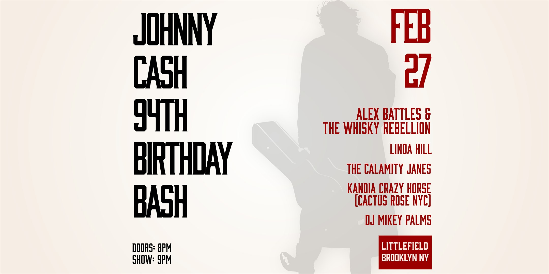 by admin13Feb Johnny Cash 94th Birthday Bash starring Linda Hill at littlefield – Brooklyn, NY Johnny Cash 94th Birthday Bash starring Linda Hill at littlefield – Brooklyn, NY 2 2 people viewed this event. The Johnny Cash 94th Birthday Bash a tribute to the Man In Black starring with Alex Battles & The Whisky Rebellion with guest Linda Hill. Tickets-RSVP Link Date And Time Saturday, February 28th, 2026 02:00 AM (PST) Venue littlefield Location 635 Sackett Street, Brooklyn, NY 11217 Event Types Concert or PerformanceMusic Event Category New York Share With Friends Facebook Twitter Linkedin Xing Pinterest Share This Post: