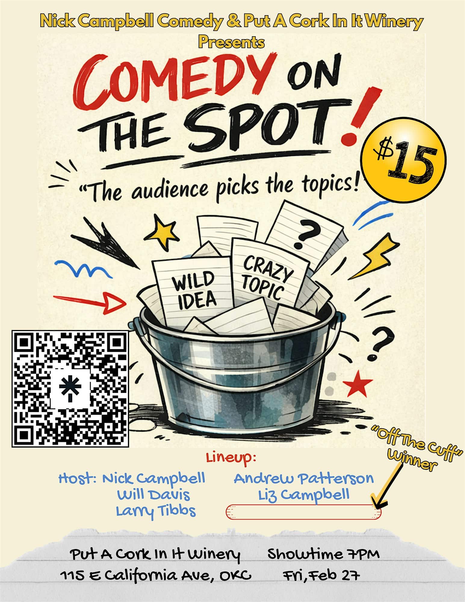 by admin14Feb Put A Cork In It: Comedy On The Spot! at Put a Cork in It – Oklahoma City, OK Put A Cork In It: Comedy On The Spot! at Put a Cork in It – Oklahoma City, OK 1 1 people viewed this event. COMEDY ON THE SPOT! Where you pick the topics we make the comedy! Tickets-RSVP Link Date And Time Saturday, February 28th, 2026 01:00 AM (PST) Venue Put a Cork in It Location 115 East California Avenue, Oklahoma City, OK 73104 Event Types Concert or PerformancePerforming & Visual Arts Event Category OklahomaOklahoma City Share With Friends Facebook Twitter Linkedin Xing Pinterest Share This Post: