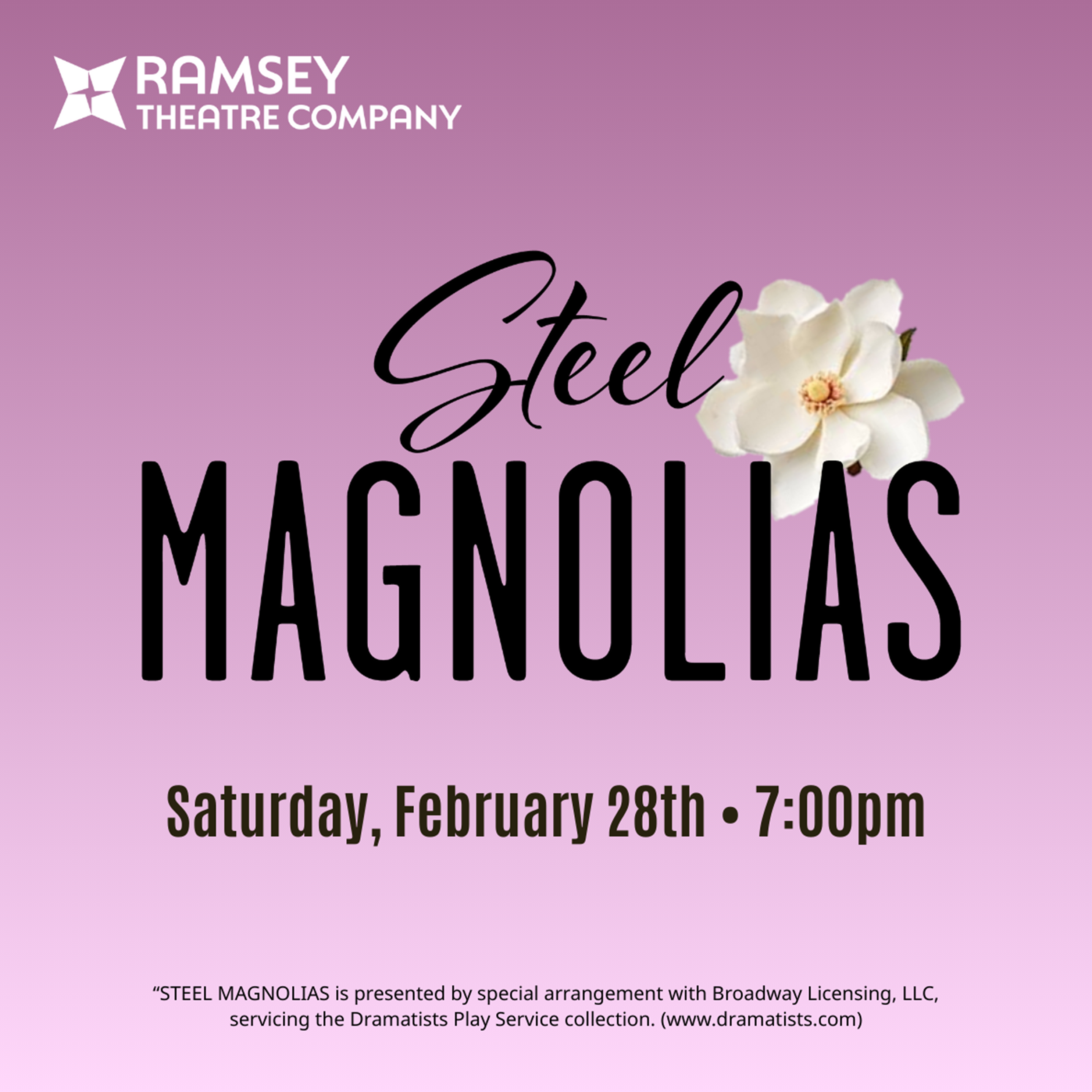 Bold Hair, Bigger Hearts: Welcome to Truvy?s Beauty Salon! Set in a small-town Louisiana beauty parlor, Steel Magnolias invites audiences into the lively world of six unforgettable Southern women who share more than just hairstyles and gossip. This heartfelt comedy-drama explores the deep bonds of friendship, resilience, and love as these women navigate life?s joys and sorrows together. Filled with sharp humor, touching moments, and candid conversations, the story unfolds through the lens of their regular salon gatherings, where laughter and tears go hand in hand. Alternately hilarious and deeply moving, Steel Magnolias is a powerful tribute to the strength, grace, and enduring spirit of women supporting one another through life?s most challenging, and beautiful, seasons.