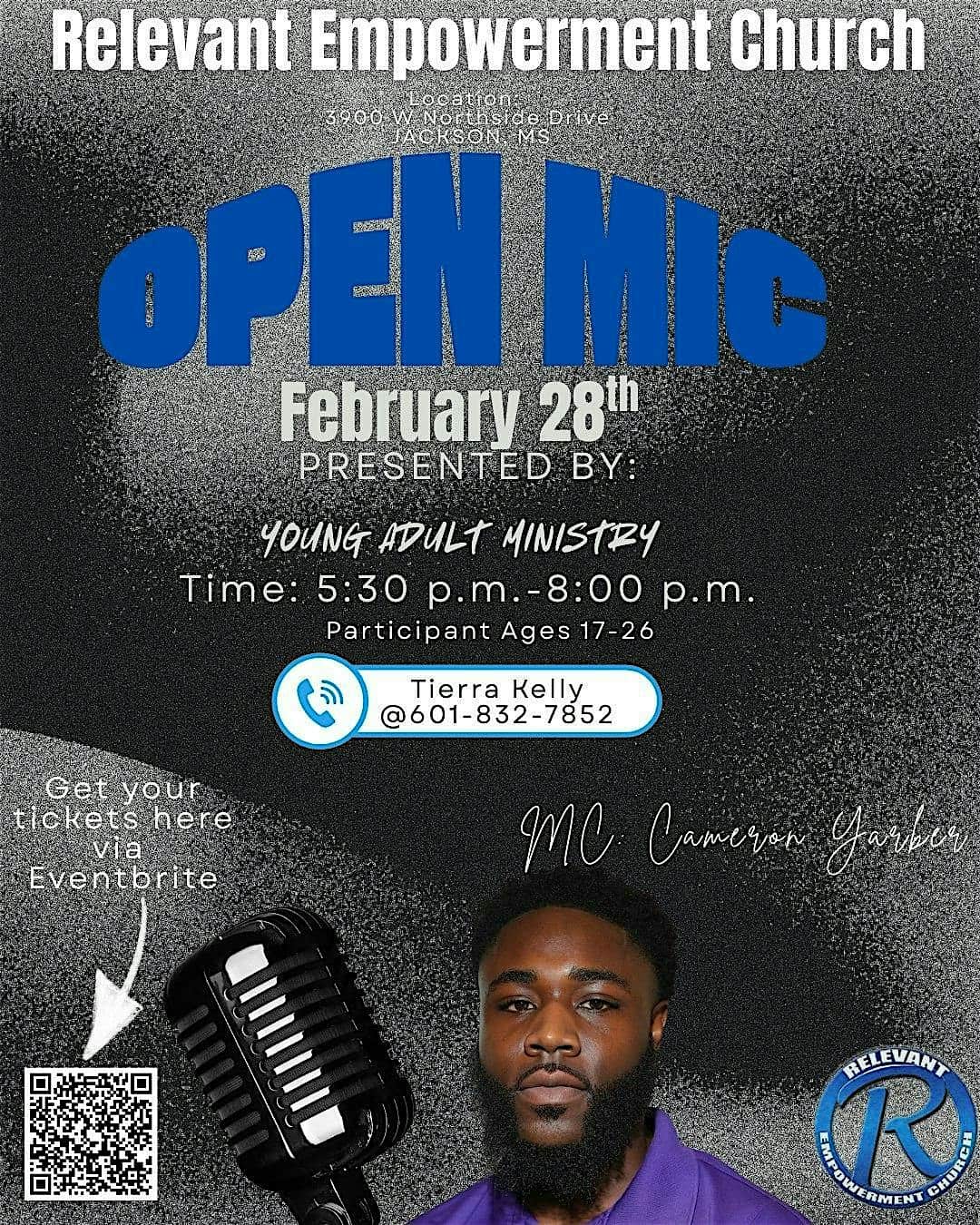 by admin14Feb Young Adult Open Mic at 3900 W Northside Dr – Jackson, MS Young Adult Open Mic at 3900 W Northside Dr – Jackson, MS 2 2 people viewed this event. Come hang out, sit back, and enjoy local Christian artists at our Young Adult Open Mic night! Tickets-RSVP Link Date And Time Saturday, February 28th, 2026 11:00 PM (PST) Venue 3900 W Northside Dr Location 3900 West Northside Drive, Jackson, MS 39209 Event Types Concert or PerformancePerforming & Visual Arts Event Category JacksonMississippi Share With Friends Facebook Twitter Linkedin Xing Pinterest Share This Post: