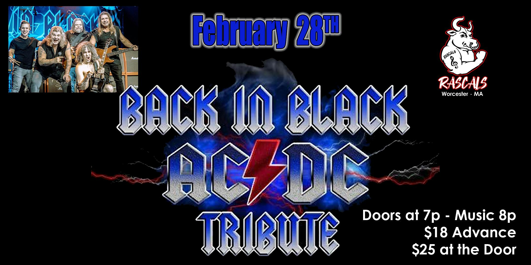 by admin13Feb Back In Black – AC/DC Tribute at Rascals – Worcester, MA Back In Black – AC/DC Tribute at Rascals – Worcester, MA 4 4 people viewed this event. Don’t miss this night with the amazing Back In Black performing all your favorite AC/DC Hits! Tickets-RSVP Link Date And Time Sunday, March 1st, 2026 01:00 AM (PST) Venue Rascals Location 70 James St, Worcester, MA 1603 Event Types Concert or PerformanceMusic Event Category Massachusetts Share With Friends Facebook Twitter Linkedin Xing Pinterest Share This Post: