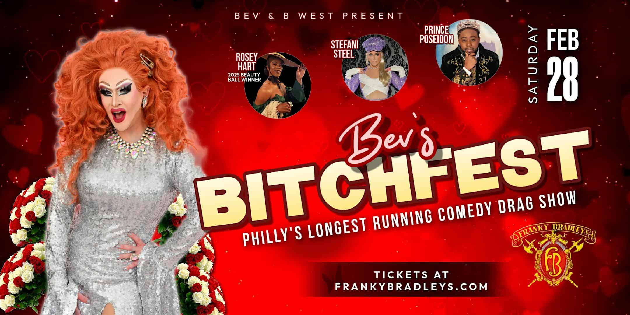 by admin14Feb Bev’s Bitchfest at Franky Bradley’s – Philadelphia, PA Bev’s Bitchfest at Franky Bradley’s – Philadelphia, PA 3 3 people viewed this event. “Can’t decide what to get your special someone for Valentine’s Day? Give the gift of Bitchfest! Tickets-RSVP Link Date And Time Sunday, March 1st, 2026 12:00 AM (PST) Venue Franky Bradley's Location 1320 Chancellor St., Philadelphia, PA 19107 Event Types Concert or PerformancePerforming & Visual Arts Event Category PennsylvaniaPhiladelphia Share With Friends Facebook Twitter Linkedin Xing Pinterest Share This Post: