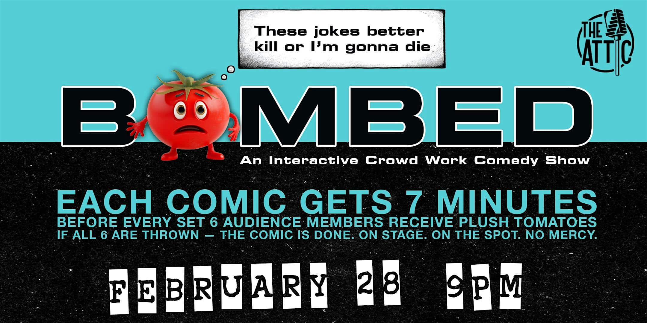 by admin14Feb BOMBED – An Interactive Crowd Work Comedy Show at The Attic Comedy Club at The Attic Comedy Club – Columbus, OH BOMBED – An Interactive Crowd Work Comedy Show at The Attic Comedy Club at The Attic Comedy Club – Columbus, OH 2 2 people viewed this event. A wild, unpredictable comedy show at The Attic Comedy Club where the audience gets the power… and the tomatoes. Tickets-RSVP Link Date And Time Sunday, March 1st, 2026 02:00 AM (PST) Venue The Attic Comedy Club Location 892 Oak Street, Columbus, OH 43205 Event Types Concert or PerformancePerforming & Visual Arts Event Category Ohio Share With Friends Facebook Twitter Linkedin Xing Pinterest Share This Post: