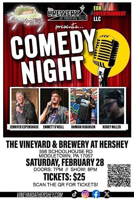 by admin14Feb Comedy Night at The Vineyard at Hershey at The Vineyard at Hershey – Middletown, PA Comedy Night at The Vineyard at Hershey at The Vineyard at Hershey – Middletown, PA 4 4 people viewed this event. Come on out for a night of grapes and giggles! Tickets-RSVP Link Date And Time Sunday, March 1st, 2026 12:00 AM (PST) Venue The Vineyard at Hershey Location 598 Schoolhouse Road, Middletown, PA 17057 Event Types Concert or PerformancePerforming & Visual Arts Event Category Pennsylvania Share With Friends Facebook Twitter Linkedin Xing Pinterest Share This Post:
