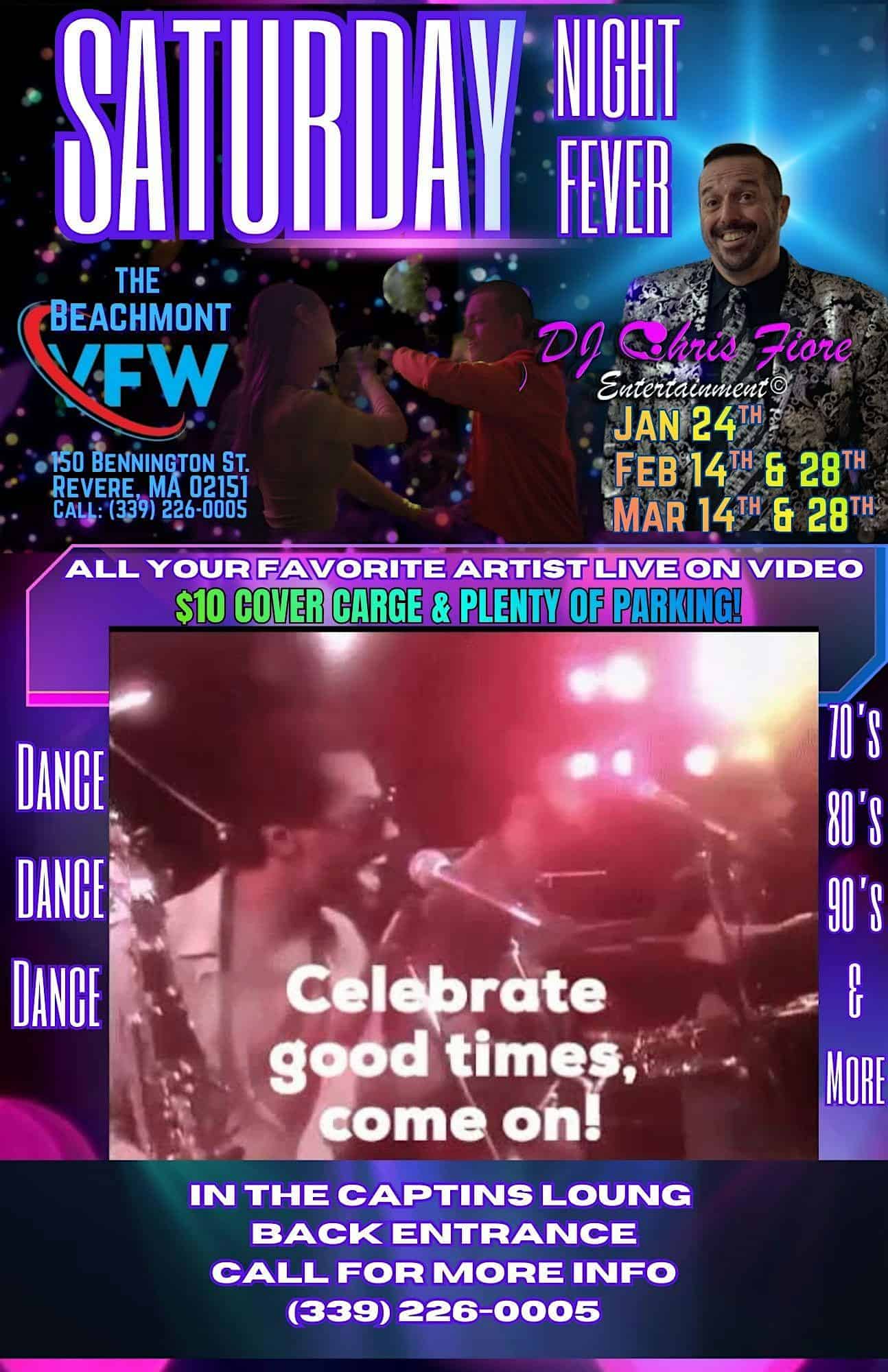 by admin14Feb Copy of SATURDAY NIGHT FEVER at Beachmont VFW – Revere, MA Copy of SATURDAY NIGHT FEVER at Beachmont VFW – Revere, MA 1 1 people viewed this event. Saturday Night Fever! Sat FEB 14, 7PM, Beachmont VFW Revere. DJ Chris Fiore video disco party! $10 cover, free parking. 617-686-1959 Tickets-RSVP Link Date And Time Sunday, March 1st, 2026 12:00 AM (PST) Venue Beachmont VFW Location 150 Bennington Street, Revere, MA 2151 Event Types Party or Social GatheringPerforming & Visual Arts Event Category Massachusetts Share With Friends Facebook Twitter Linkedin Xing Pinterest Share This Post: