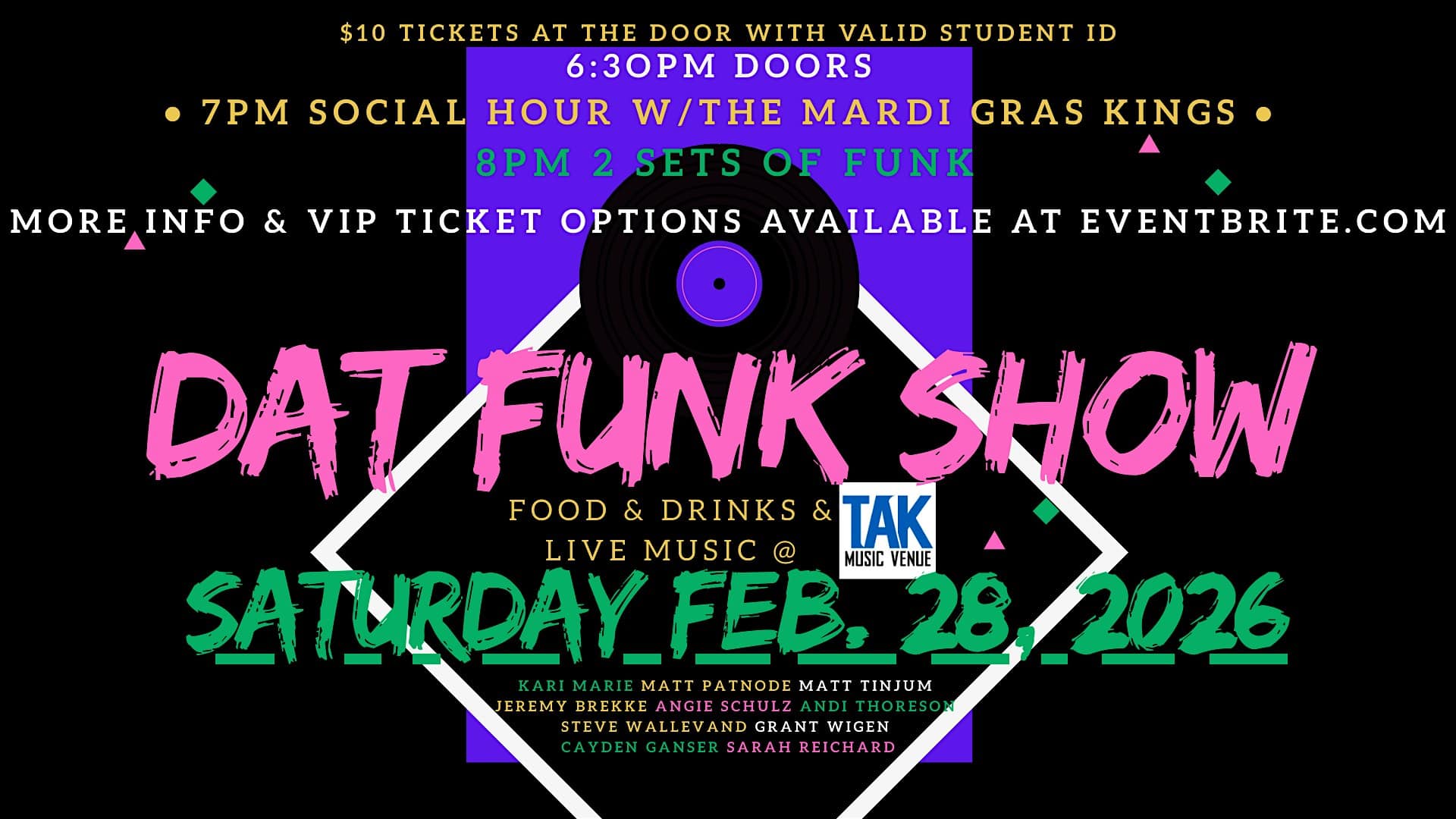 by admin14Feb Dat Funk Show with Live Performances and Social Hour at TAK Music Venue – Dilworth, MN Dat Funk Show with Live Performances and Social Hour at TAK Music Venue – Dilworth, MN 1 1 people viewed this event. Get ready to groove at Dat Funk Show, where good food, cold drinks, and live music will keep you moving all night long! Tickets-RSVP Link Date And Time Sunday, March 1st, 2026 01:00 AM (PST) Venue TAK Music Venue Location 1710 Center Avenue West, Dilworth, MN 56529 Event Types Concert or PerformancePerforming & Visual Arts Event Category Minnesota Share With Friends Facebook Twitter Linkedin Xing Pinterest Share This Post: