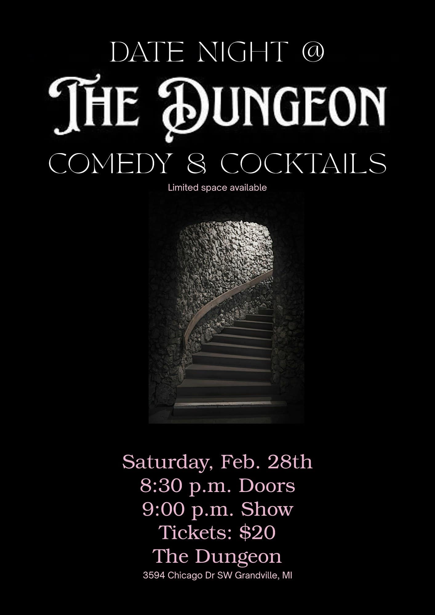 by admin14Feb Date Night: Comedy & Cocktails at The Dungeon – Grandville, MI Date Night: Comedy & Cocktails at The Dungeon – Grandville, MI 1 1 people viewed this event. Get ready to laugh until your stomach hurts while sipping on delicious cocktails at our Date Night: Comedy & Cocktails at the Dungeon Tickets-RSVP Link Date And Time Sunday, March 1st, 2026 02:00 AM (PST) Venue The Dungeon Location 3594 Chicago Drive Southwest, Grandville, MI 49418 Event Types Concert or PerformancePerforming & Visual Arts Event Category Michigan Share With Friends Facebook Twitter Linkedin Xing Pinterest Share This Post:
